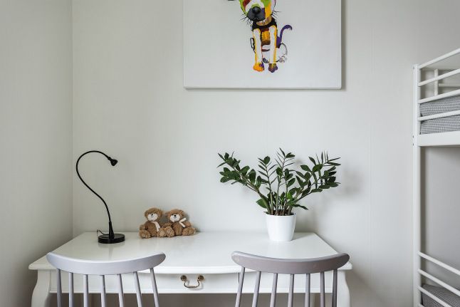 Zona de noapte cuprinde cele doua dormitoare: matrimonial si camera copiilor. Un decor minimal, confortabil, in paleta de griuri si alb ne confirma inca o data ca “less is more”. Folosind paturi supraetajate si o masa cu doua scaune pe post de birou, designerul a decorat eficient spatiul in comun al copiilor acestei familii.