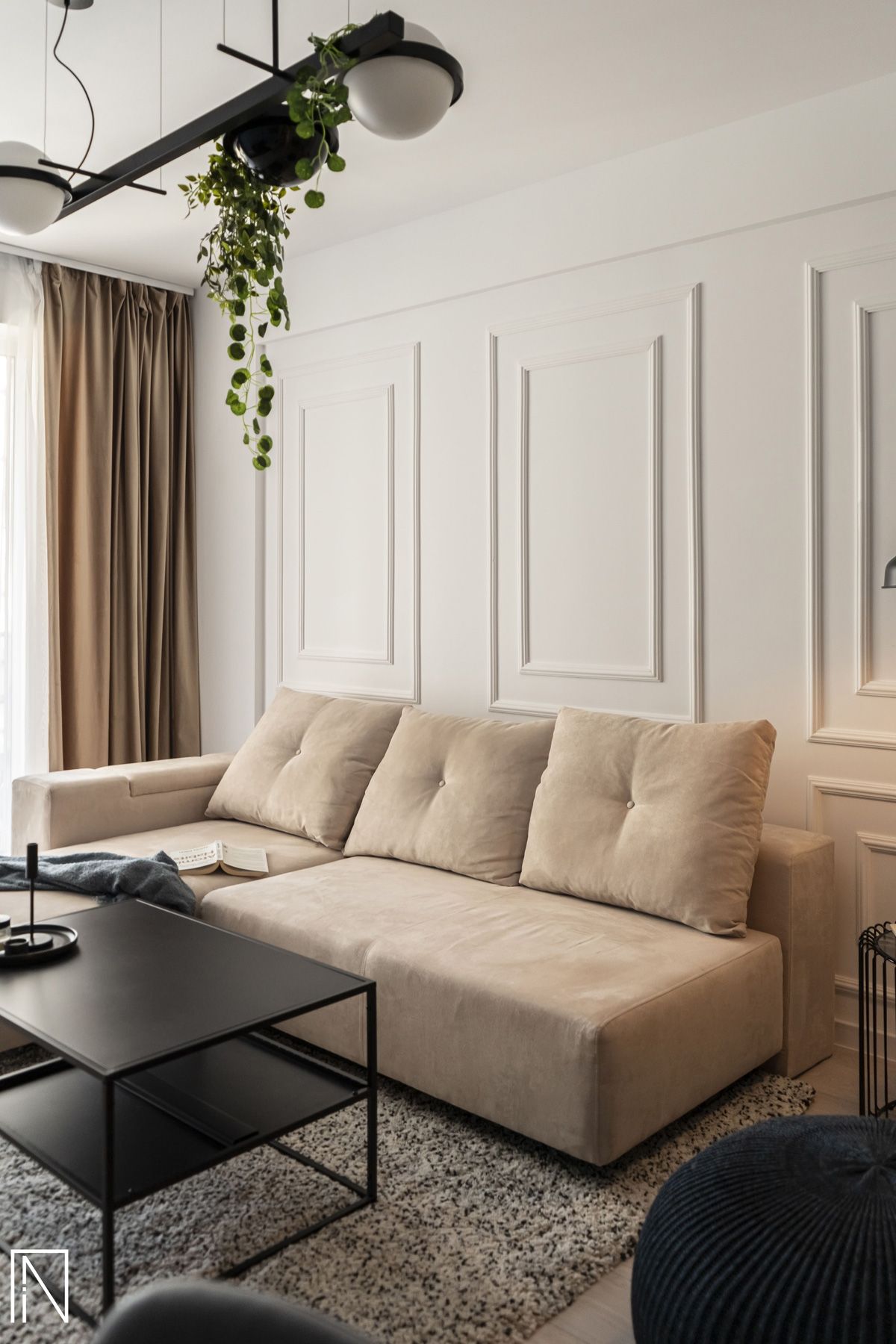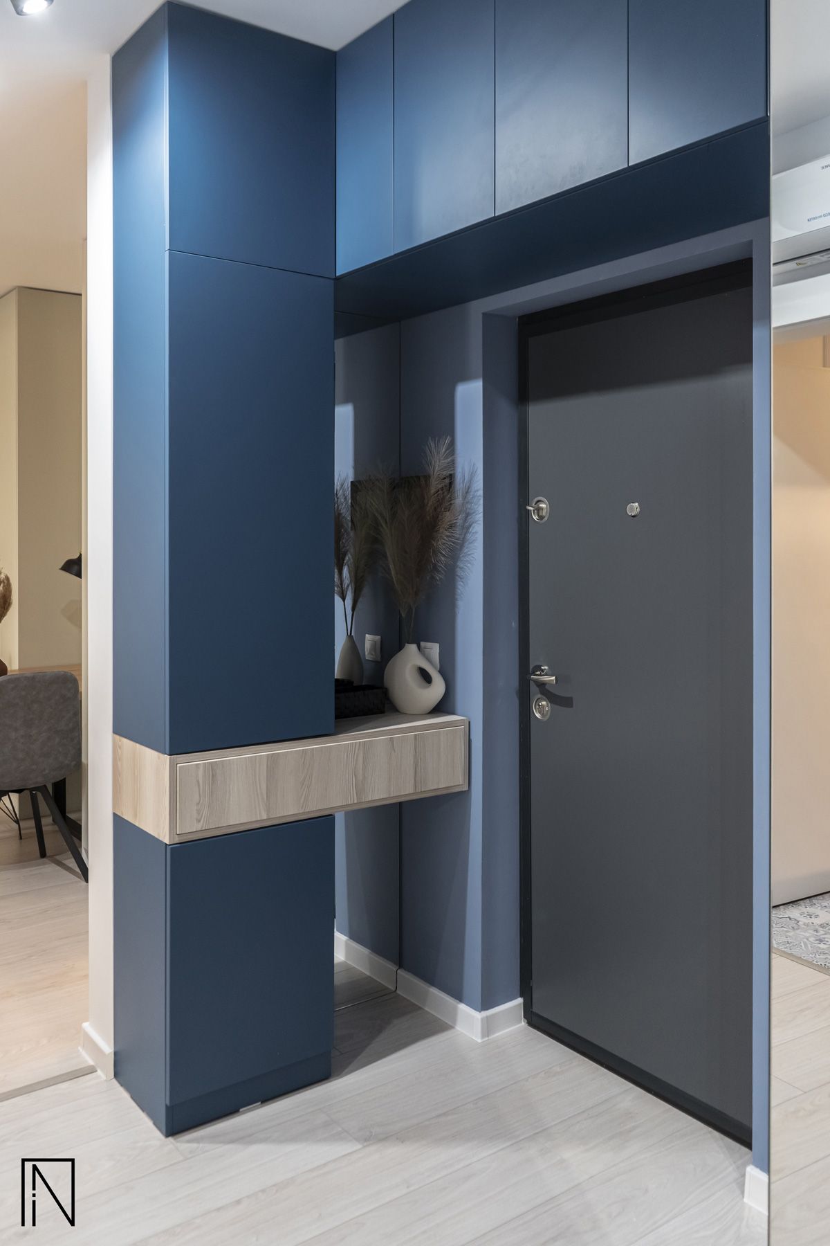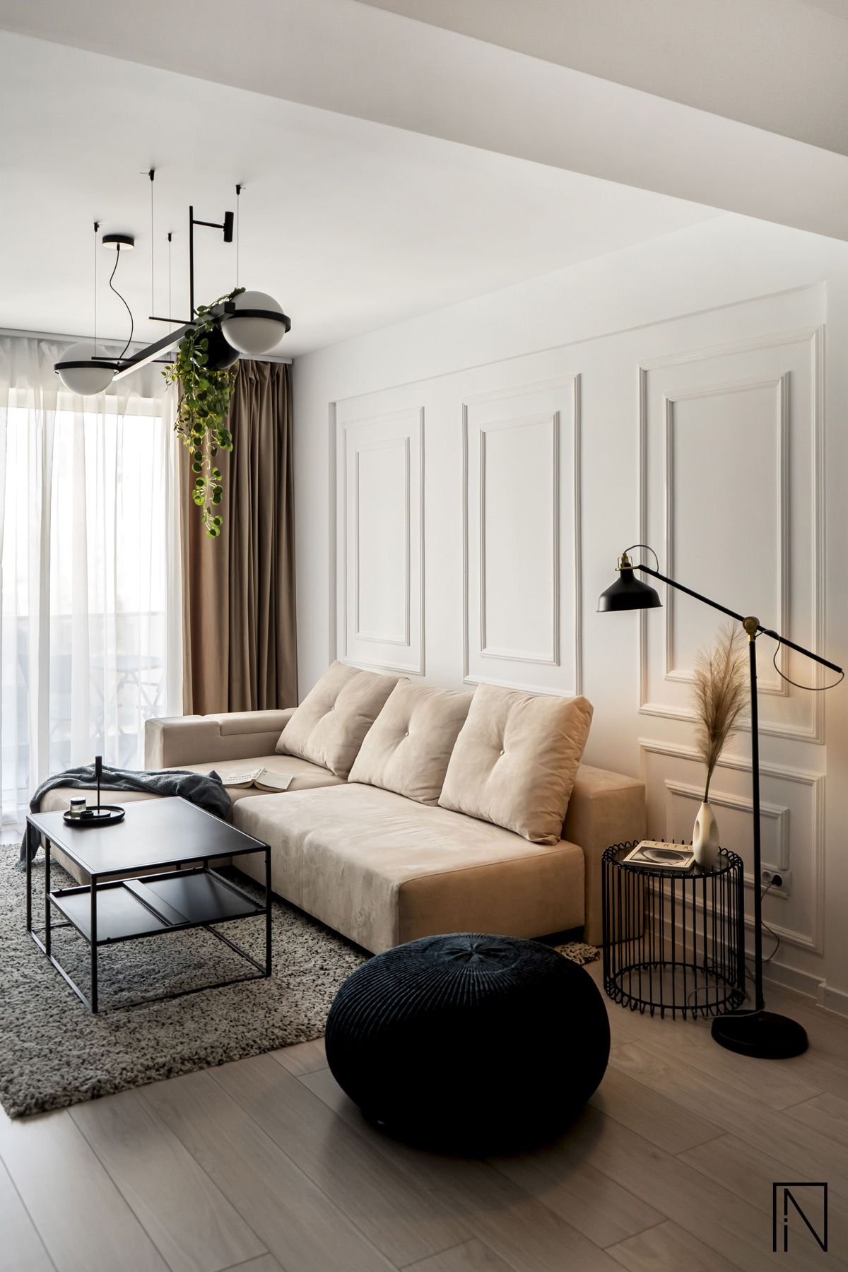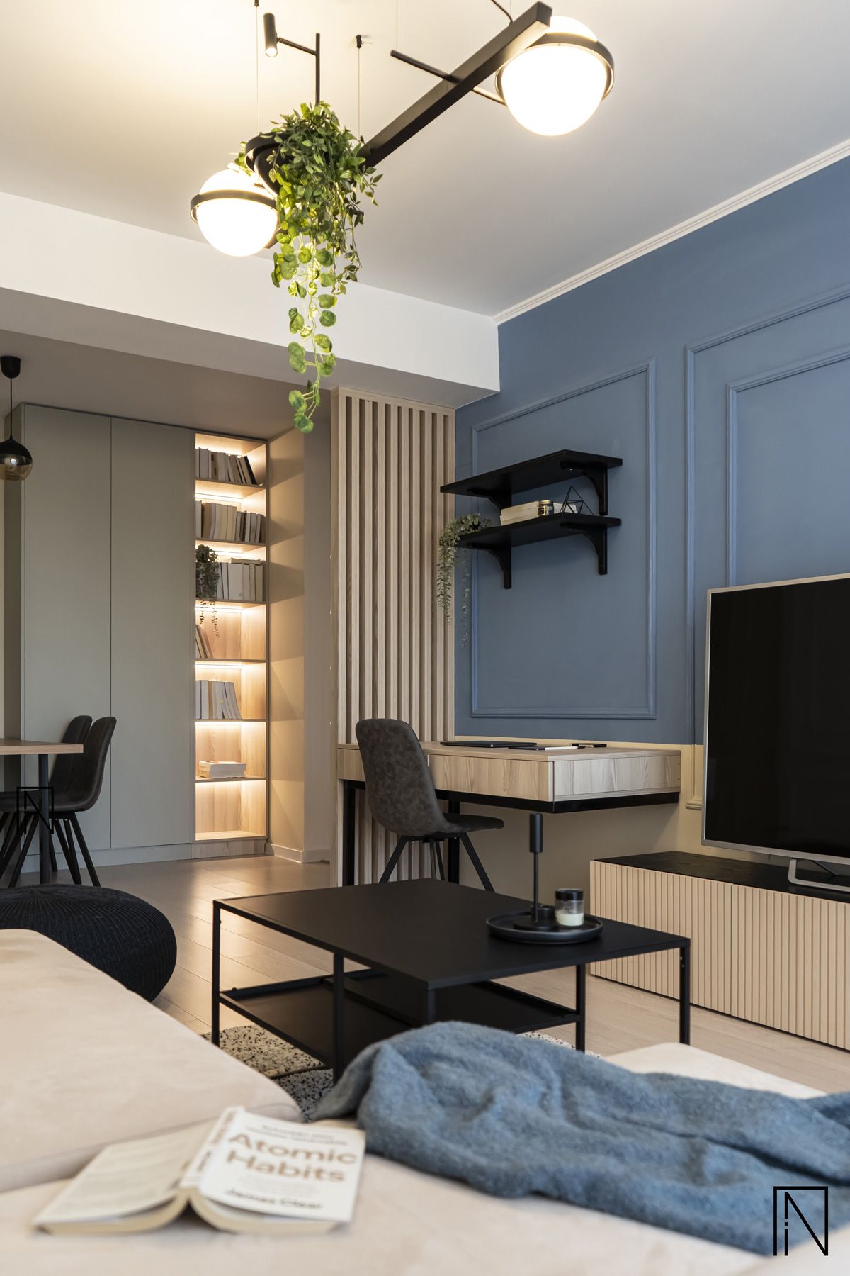 Situat intr-un bloc nou construit, apartamentul a fost preluat de catre echipa de design interior Intento Studio avand toate finisajele incluse (parchetul laminat, lavabila generala alba, usile si baia complet echipata). Provocarea a constat in personalizarea spatiului si adaptarea acestuia la necesitatile beneficiarului si a stilului dorit de acesta. Regasim mult lemn (riflaje si decoruri), vopsea mata in tonuri nisipii si accente de albastru, texturi moi, catifelate.