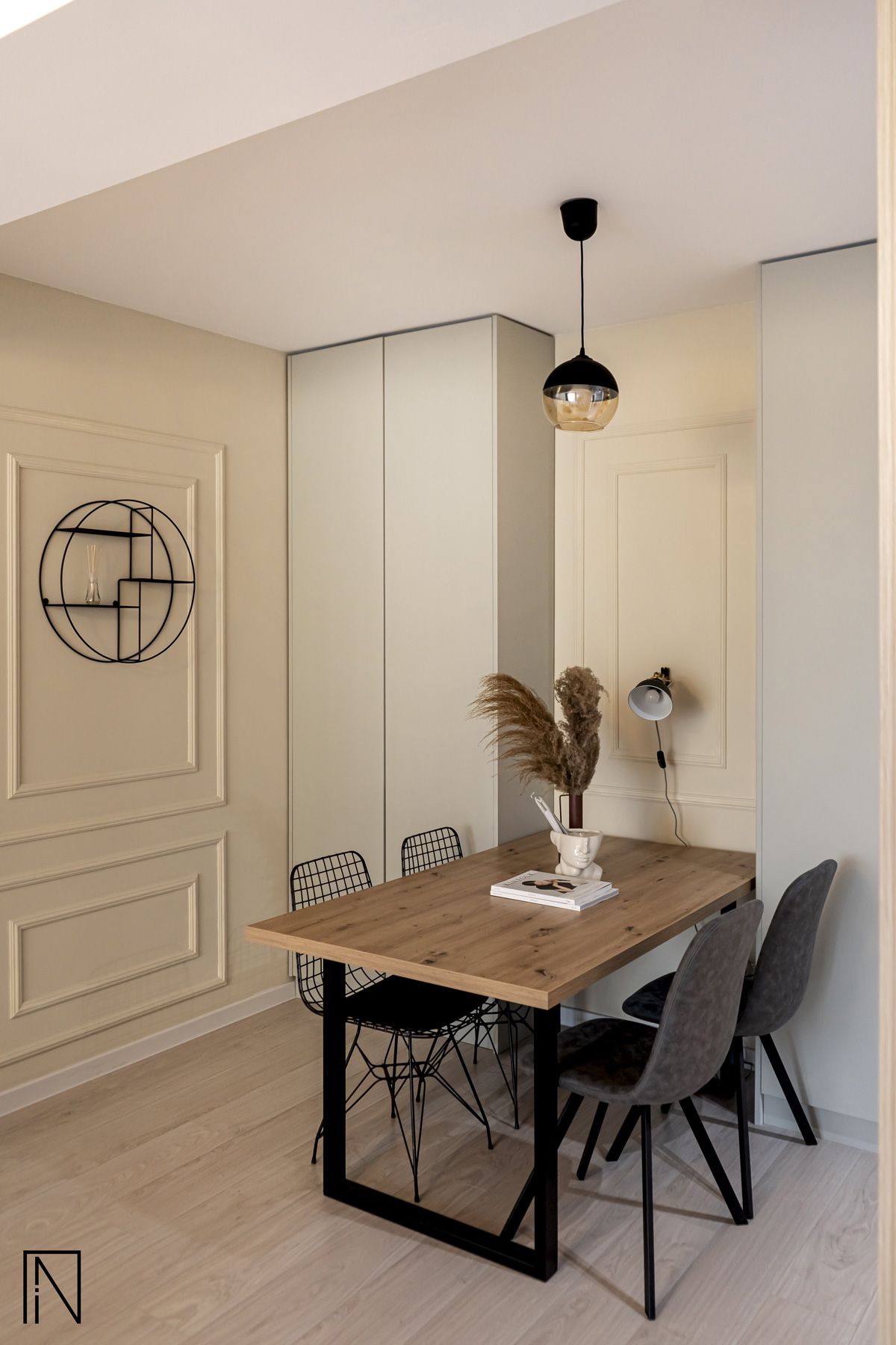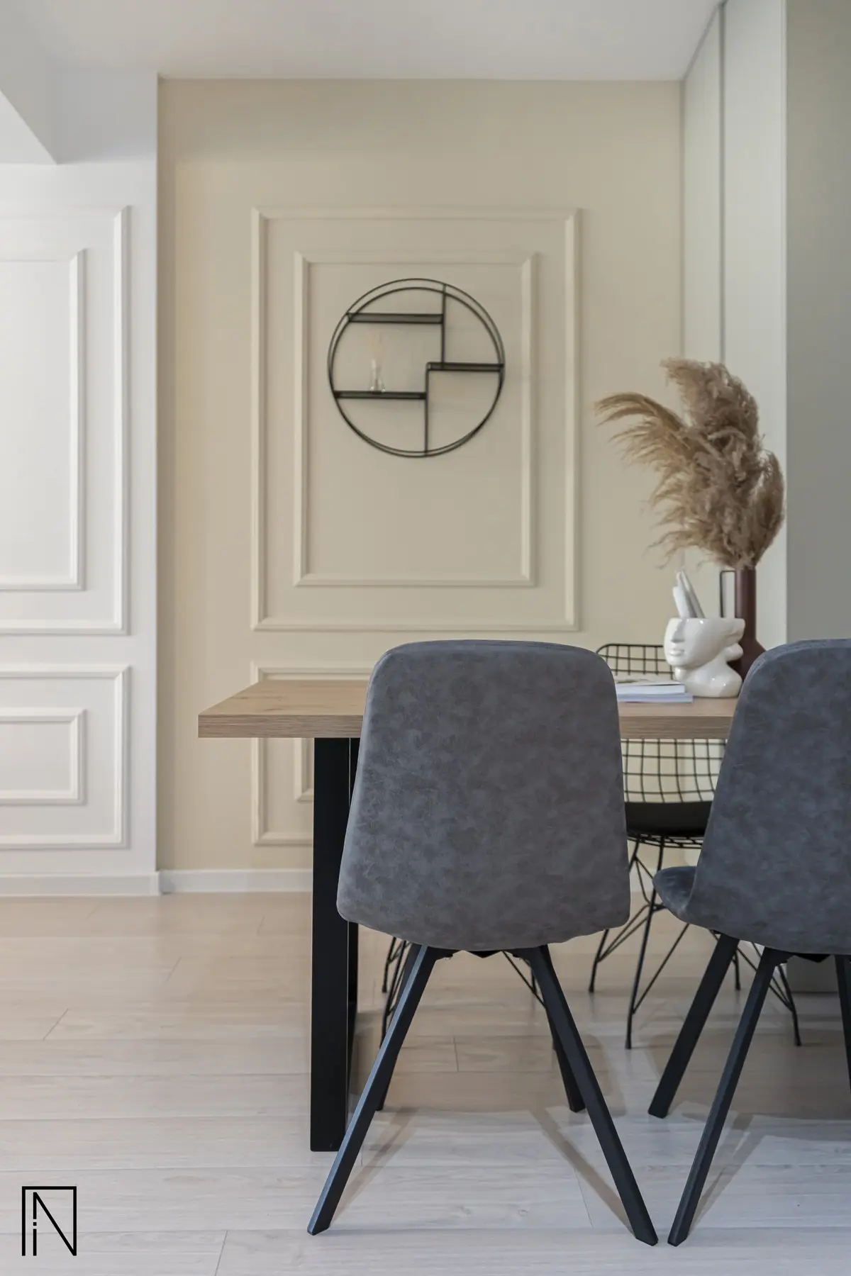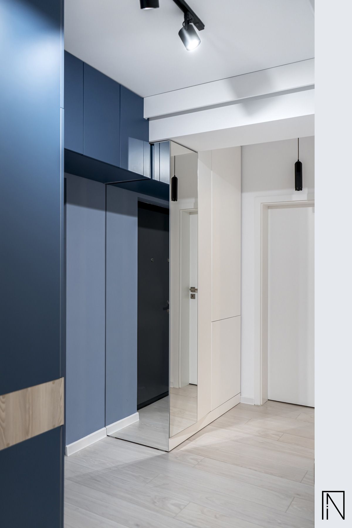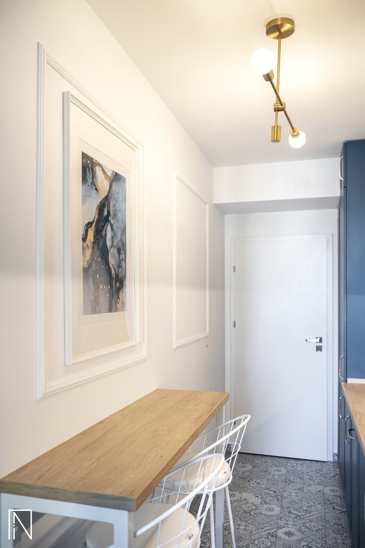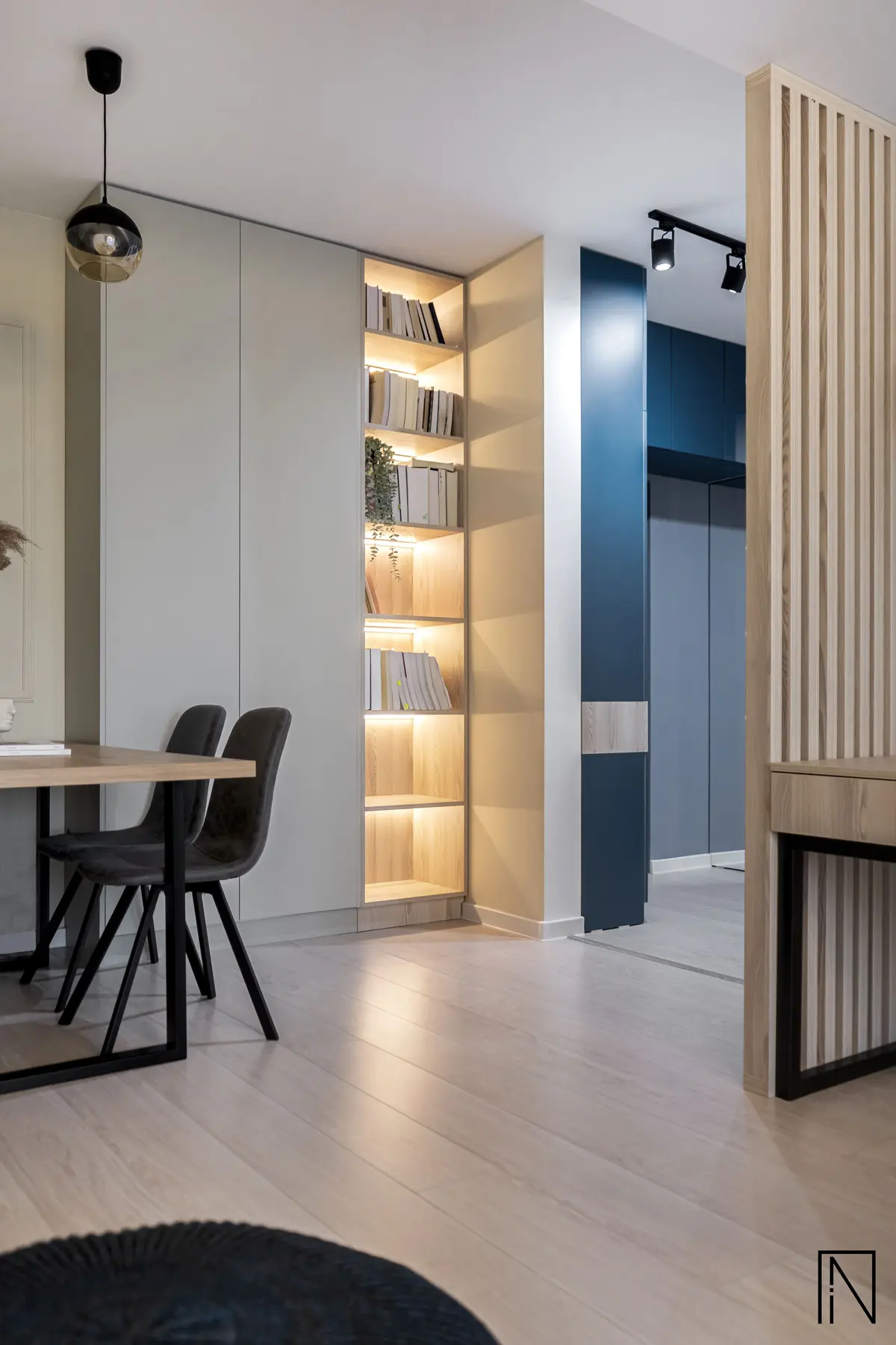 Situat intr-un bloc nou construit, apartamentul a fost preluat de catre echipa de design interior Intento Studio avand toate finisajele incluse (parchetul laminat, lavabila generala alba, usile si baia complet echipata). Provocarea a constat in personalizarea spatiului si adaptarea acestuia la necesitatile beneficiarului si a stilului dorit de acesta. Regasim mult lemn (riflaje si decoruri), vopsea mata in tonuri nisipii si accente de albastru, texturi moi, catifelate.