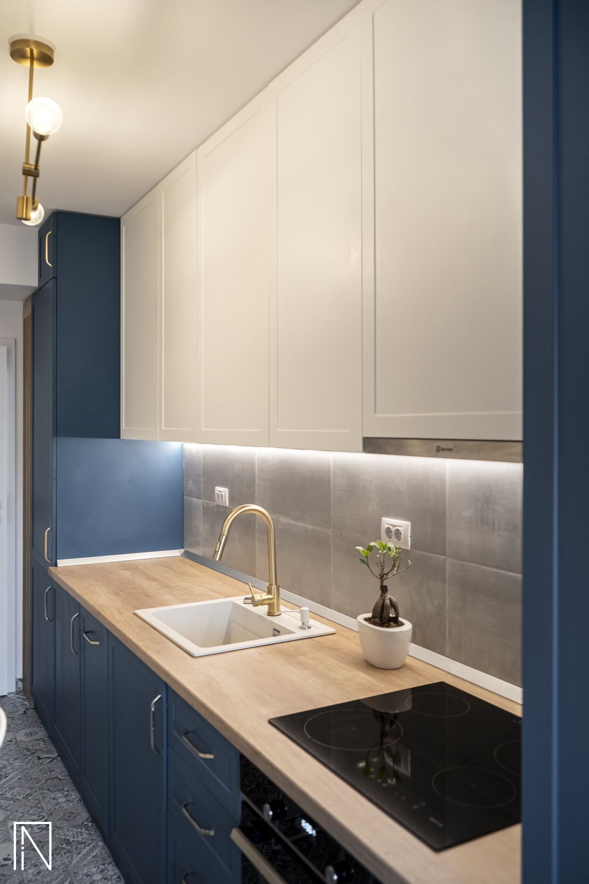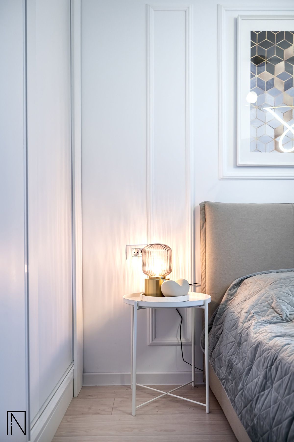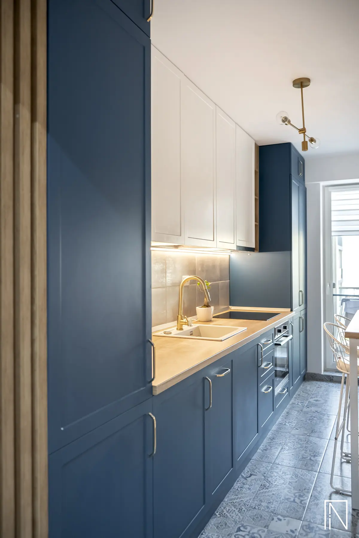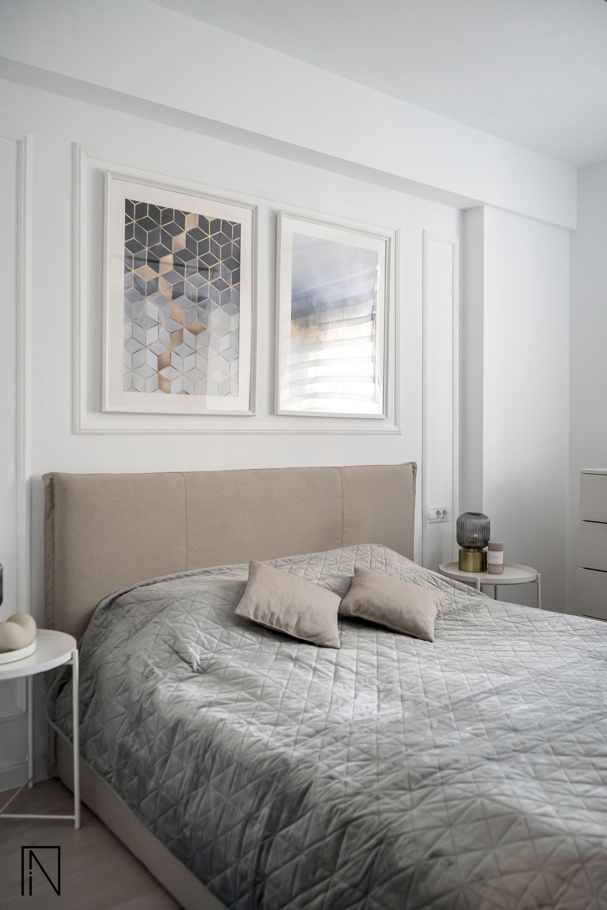 Situat intr-un bloc nou construit, apartamentul a fost preluat de catre echipa de design interior Intento Studio avand toate finisajele incluse (parchetul laminat, lavabila generala alba, usile si baia complet echipata). Provocarea a constat in personalizarea spatiului si adaptarea acestuia la necesitatile beneficiarului si a stilului dorit de acesta. Regasim mult lemn (riflaje si decoruri), vopsea mata in tonuri nisipii si accente de albastru, texturi moi, catifelate.