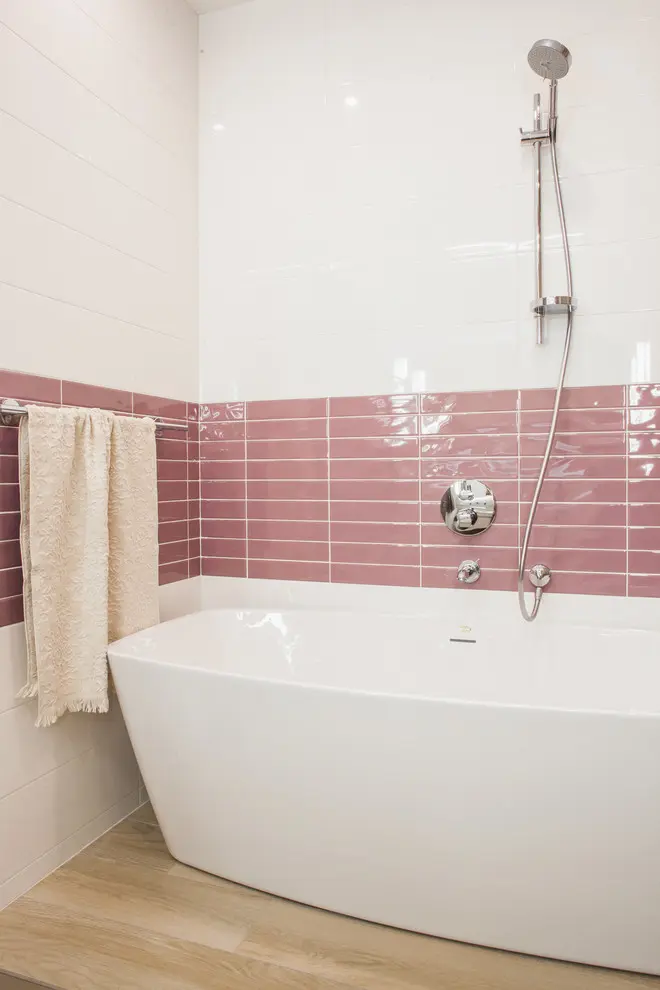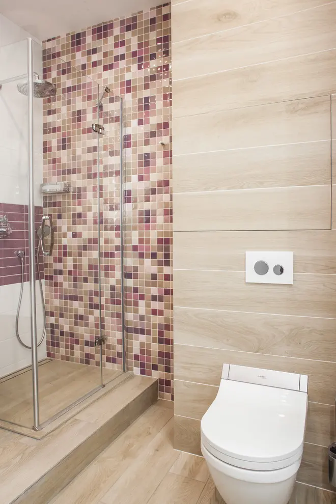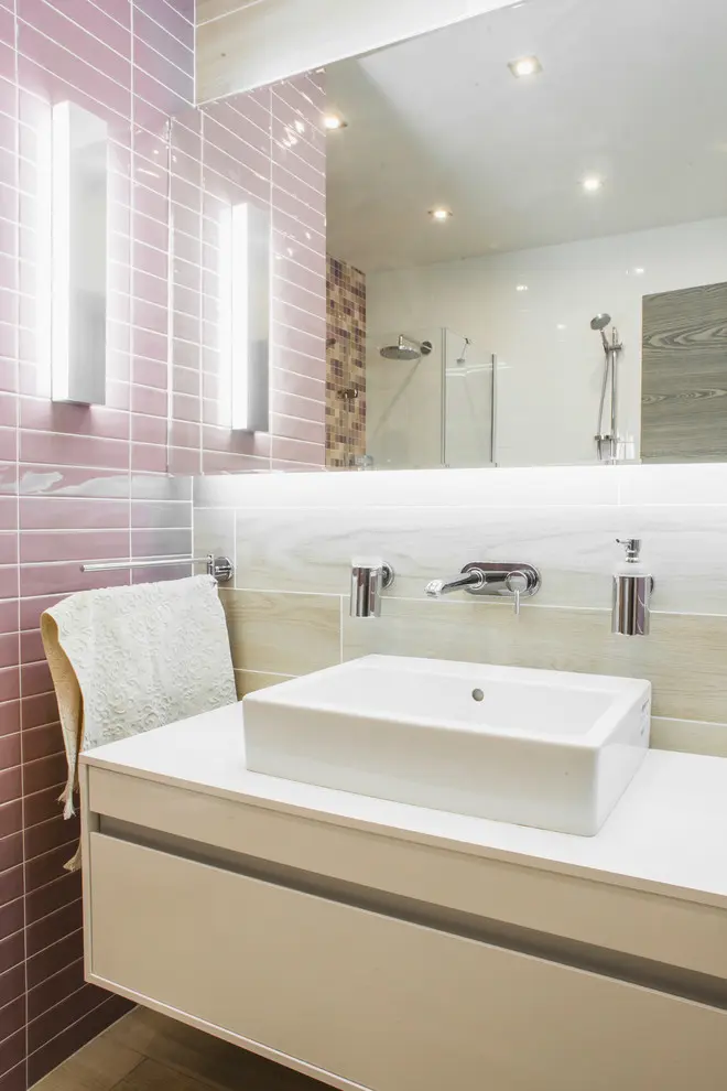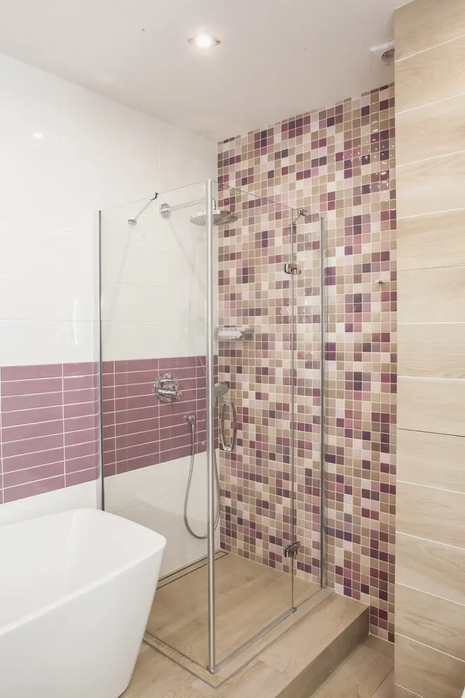 In acelasi spirit a fost conturata si baia, un spatiu mai amplu, care a permis instalarea unei cazi, dar si a unei cabine de dus marcata printr-un perete cu mozaic.