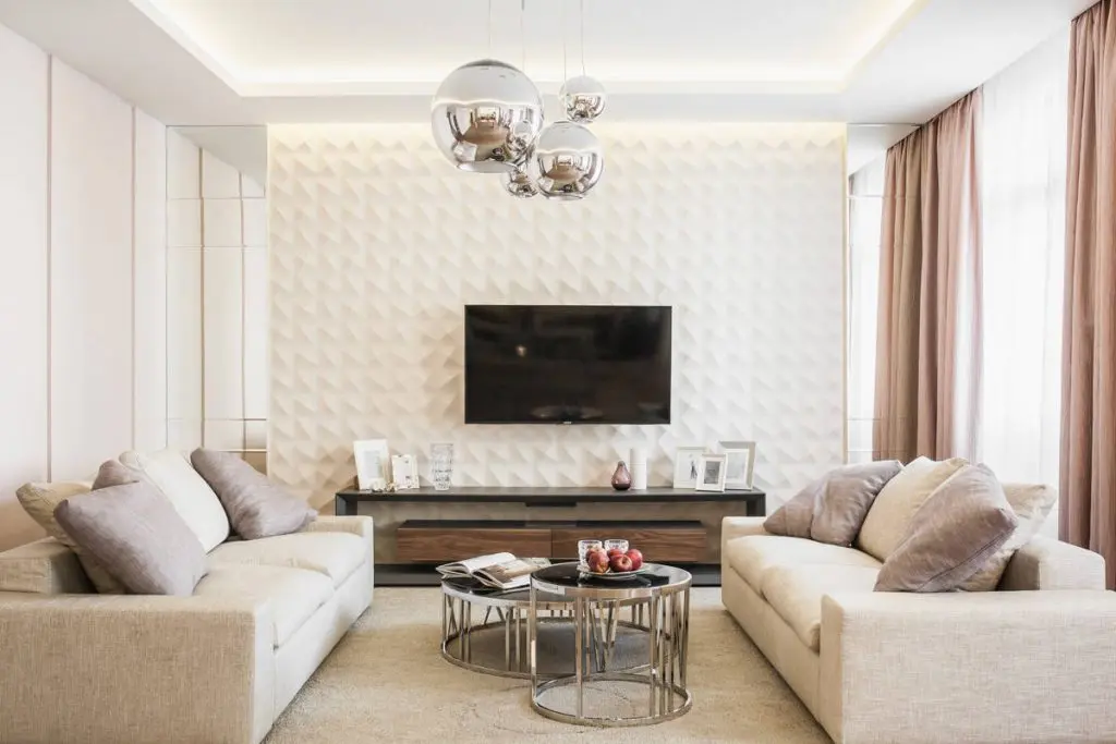 Pentru living s-a urmarit crearea unor simetrii pe care le percepem la nivelul celor doua canapele sau al suprafetelor cu oglinzi dispuse de o parte si cealalta a panoului decorativ. Delimitarea de restul spatiului se face vizual prinbenzile L EDdin tavanul fals.
