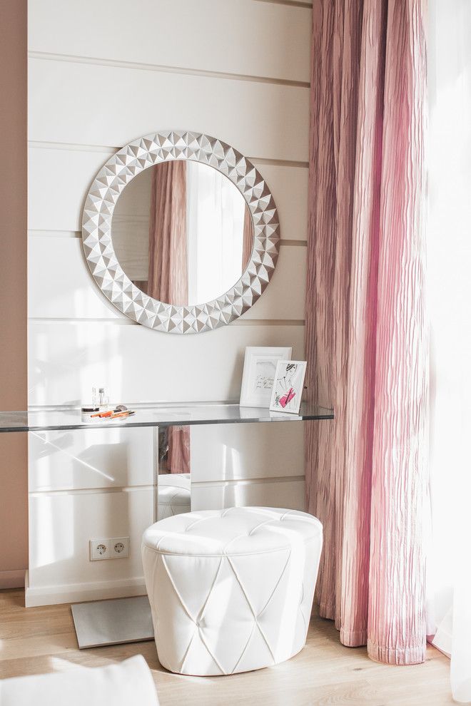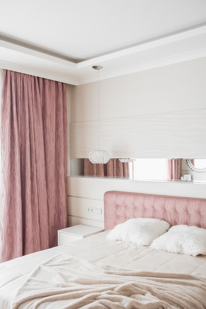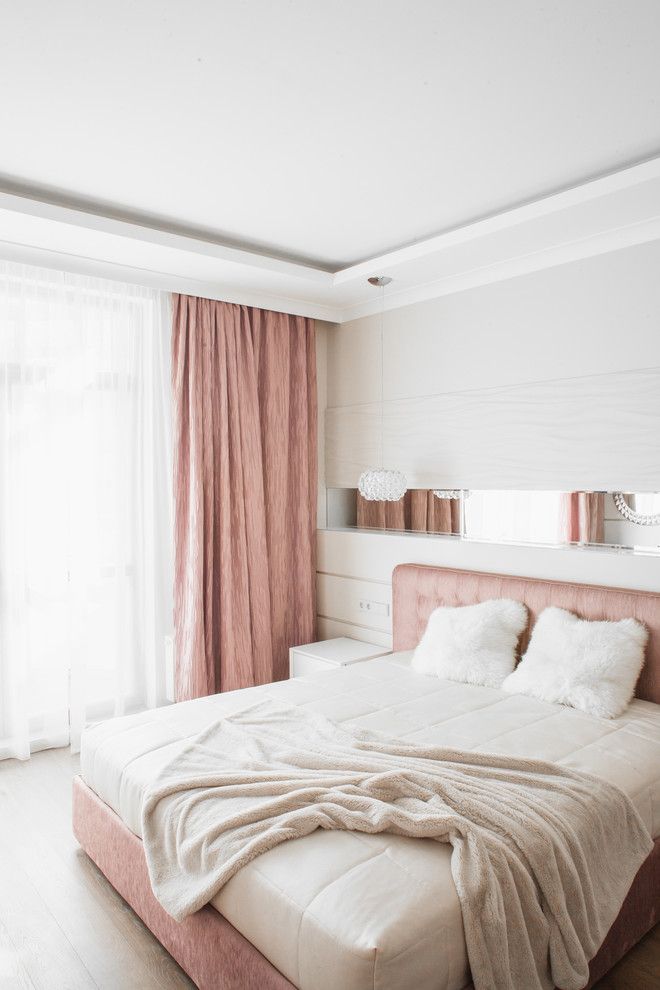 Si in dormitor se reia schema de neutre, cu accente de roz prafuit, o nuanta cuminte, calda, in spiritul ambientului dorit pentru un astfel de spatiu. Finisajele si texturile redau o senzatie de confort si tihna, intr-o nota usor feminina. Aceasta latura este mai pronuntata prinzona de make-upamenajata langa fereastra.