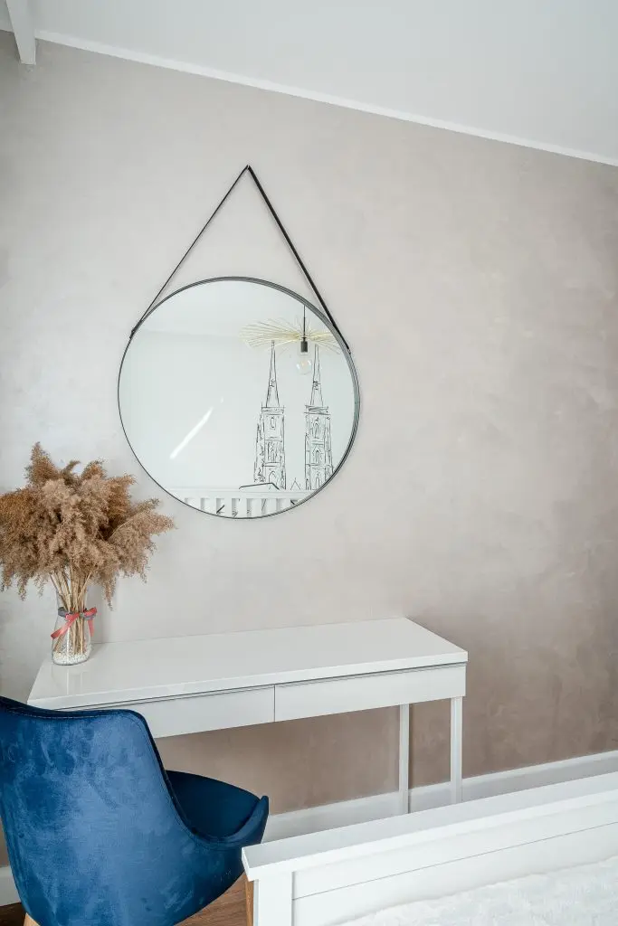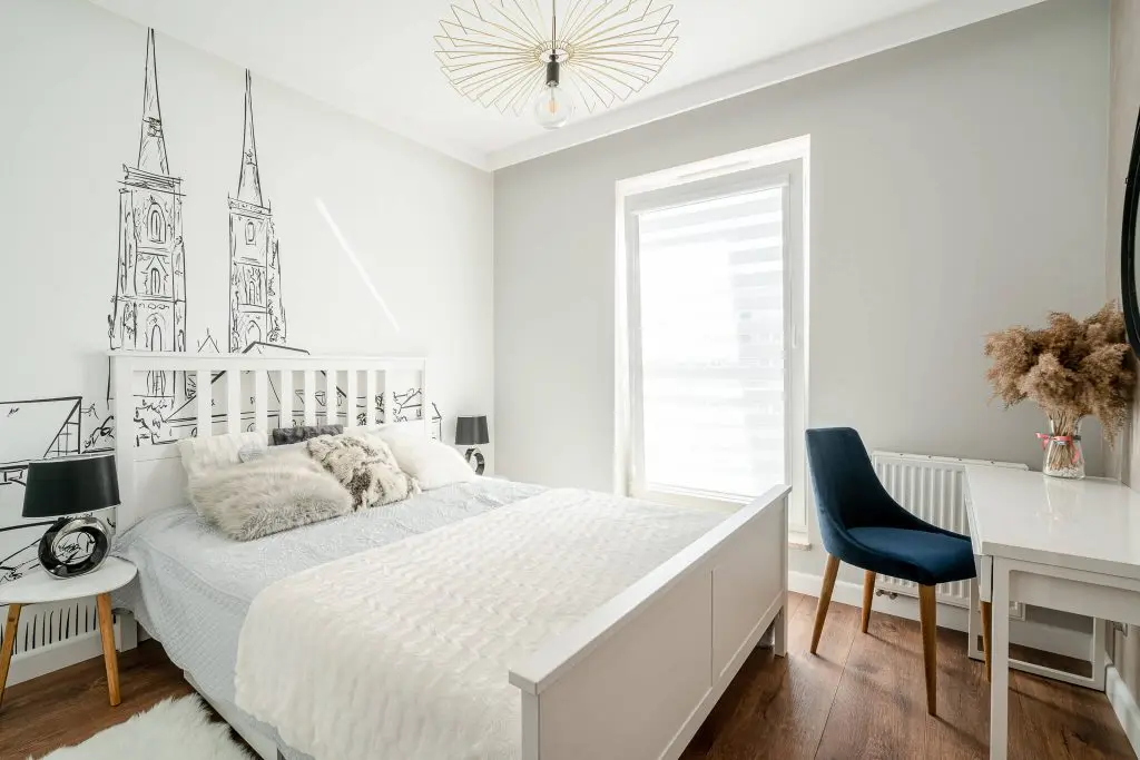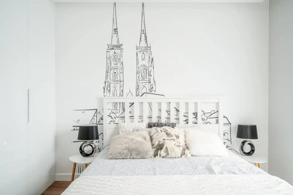 In dormitorul matrimonial, pe peretele din spatele patului a fost realizata o schita a unui oras medieval, care transpare prin tablia din zabrele; detaliu ce confera personalitate spatiului.