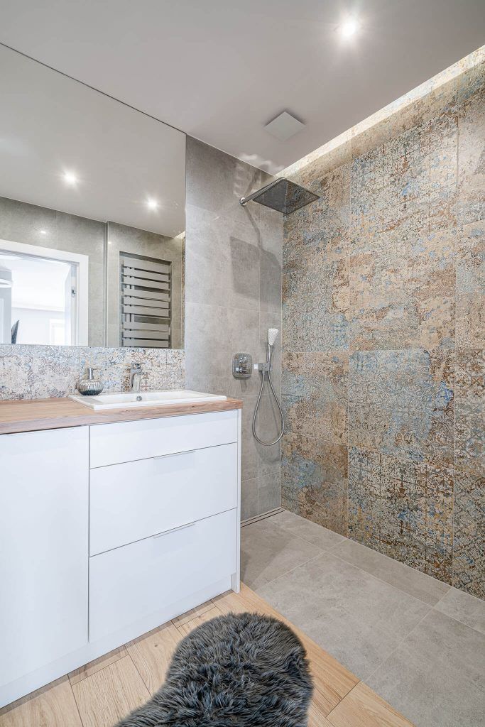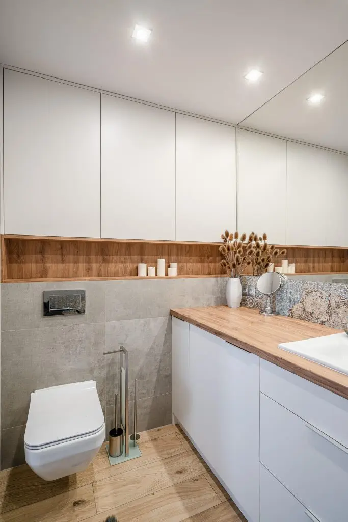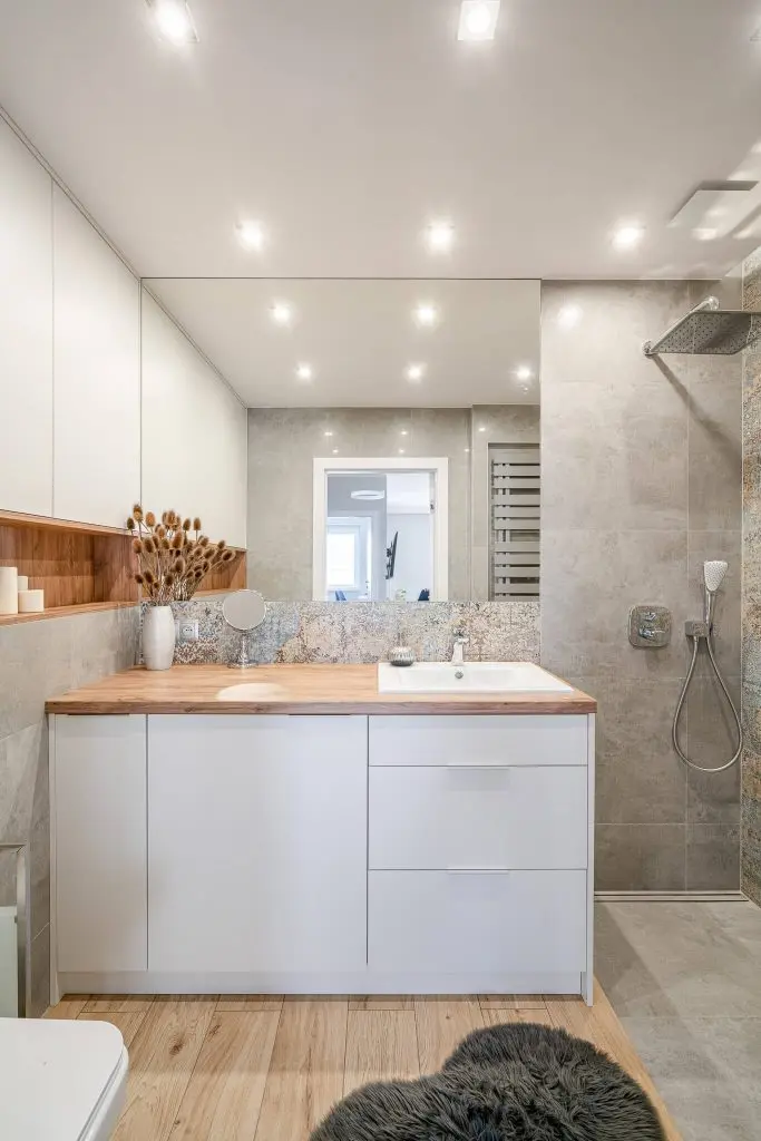 Parchetul din lemn de stejar folosit in intreaga locuinta, mai putin in baie, mareste vizual spatiul si unifica zonele. Totodata, foloseste ca fundal contrastant pentru restul finisajelor din cadrul amenajarii.