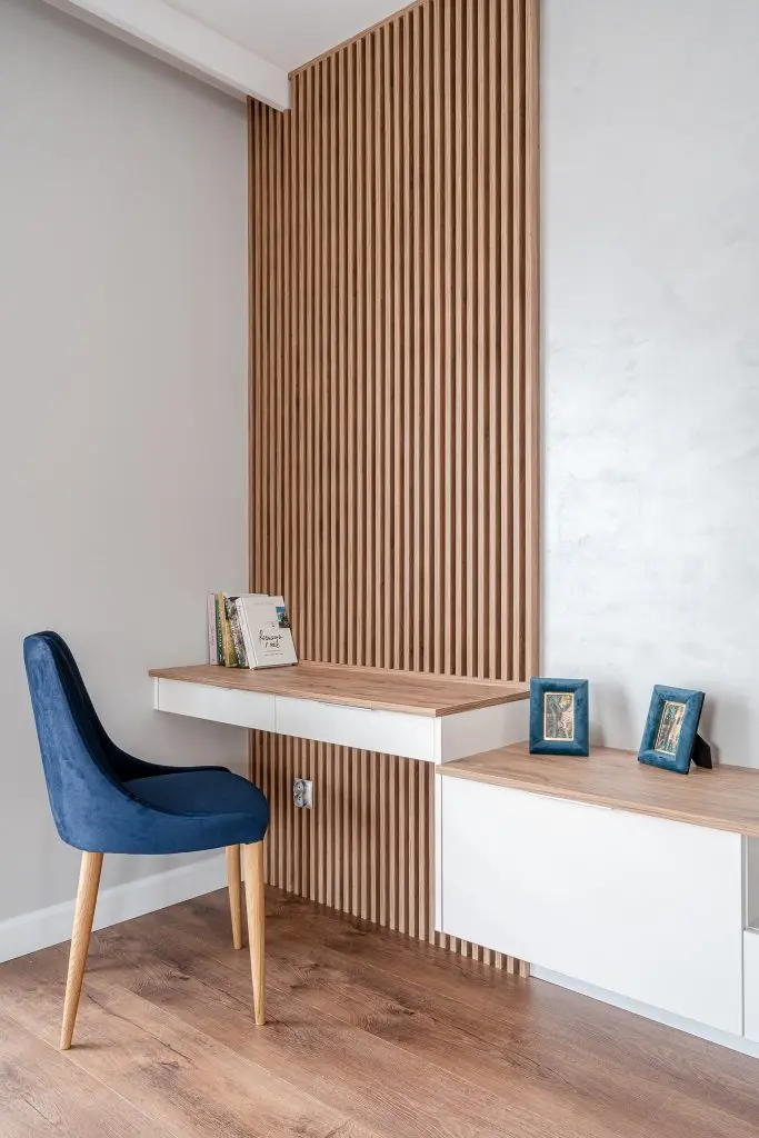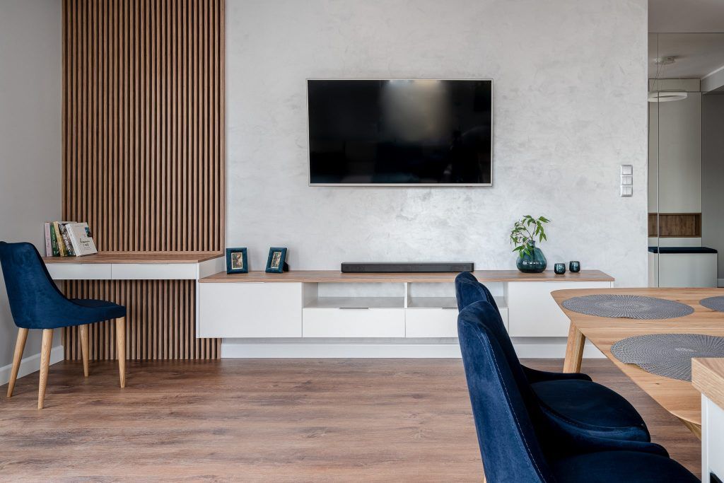 Pe peretele multifunctional din living regasim o placare cu lamele verticale de lemn care maresc vizual inaltimea spatiului, un mic birou in prelungirea comodei suspendate de perete.