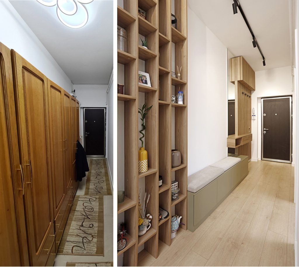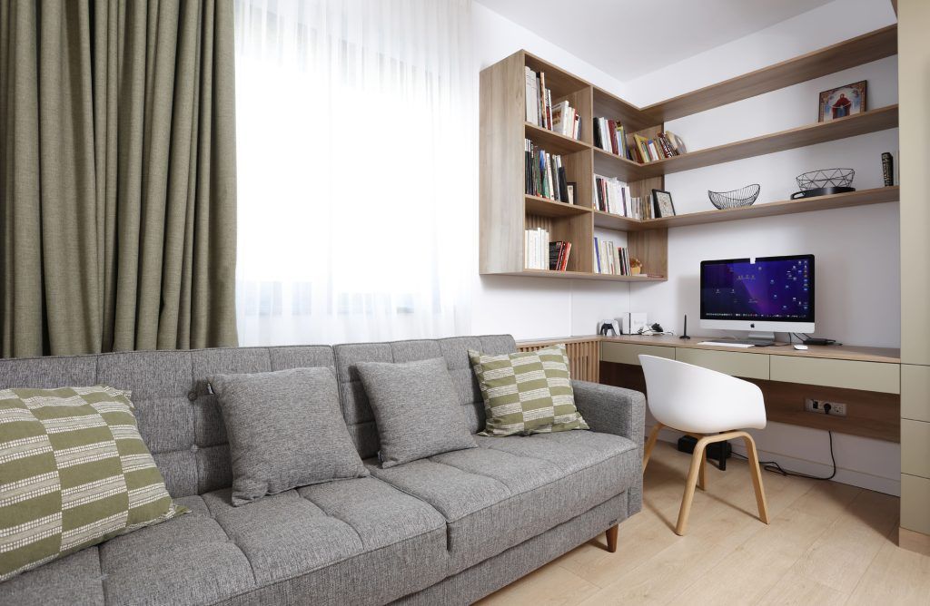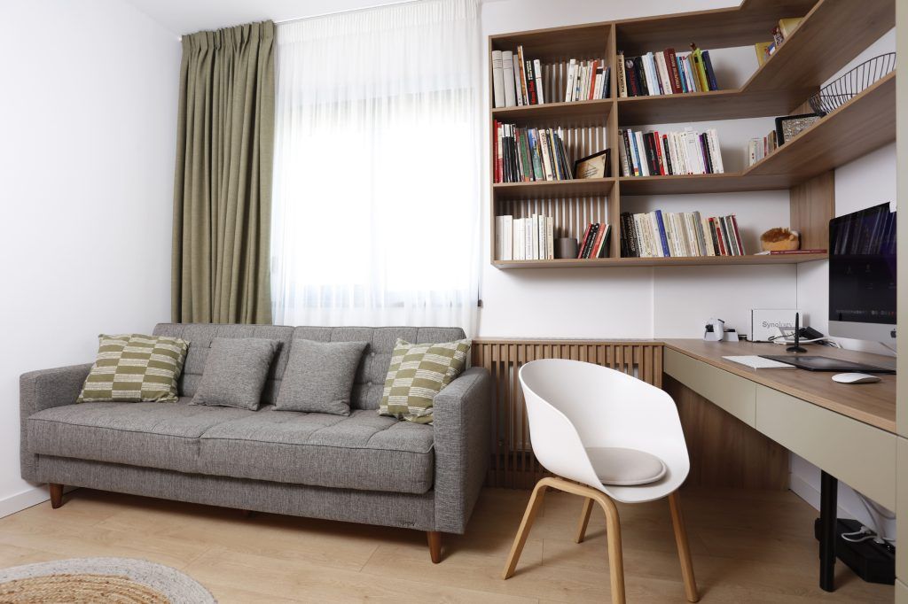 A doua camera a locuintei a fost transformata in birou pentru tinerii proprietari, pentru zilele in care aleg sa lucreze de acasa sau pentru a se retrage aici seara sa citeasca. Regasim aici o biblioteca si birou de colt, realizate la comanda din lemn si fronturi vopsite kaki. Biroul se prelungeste cu o masca de calorifer din riflaje de lemn.