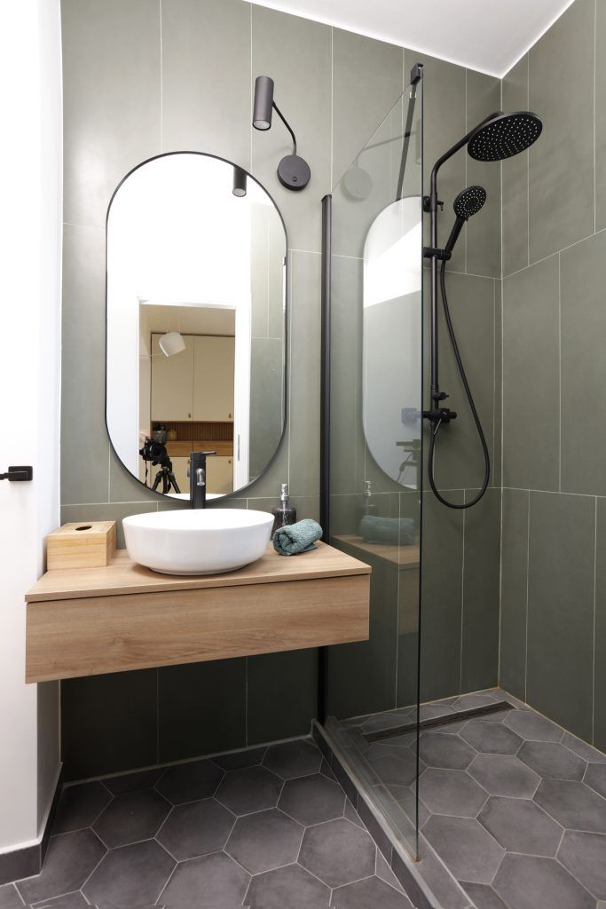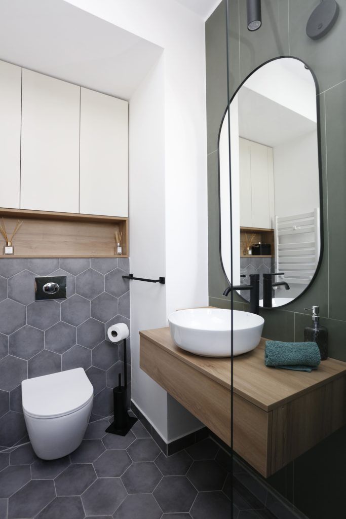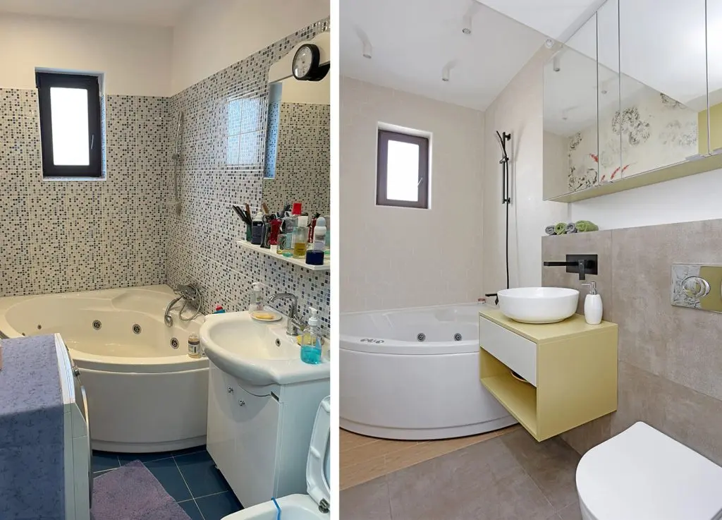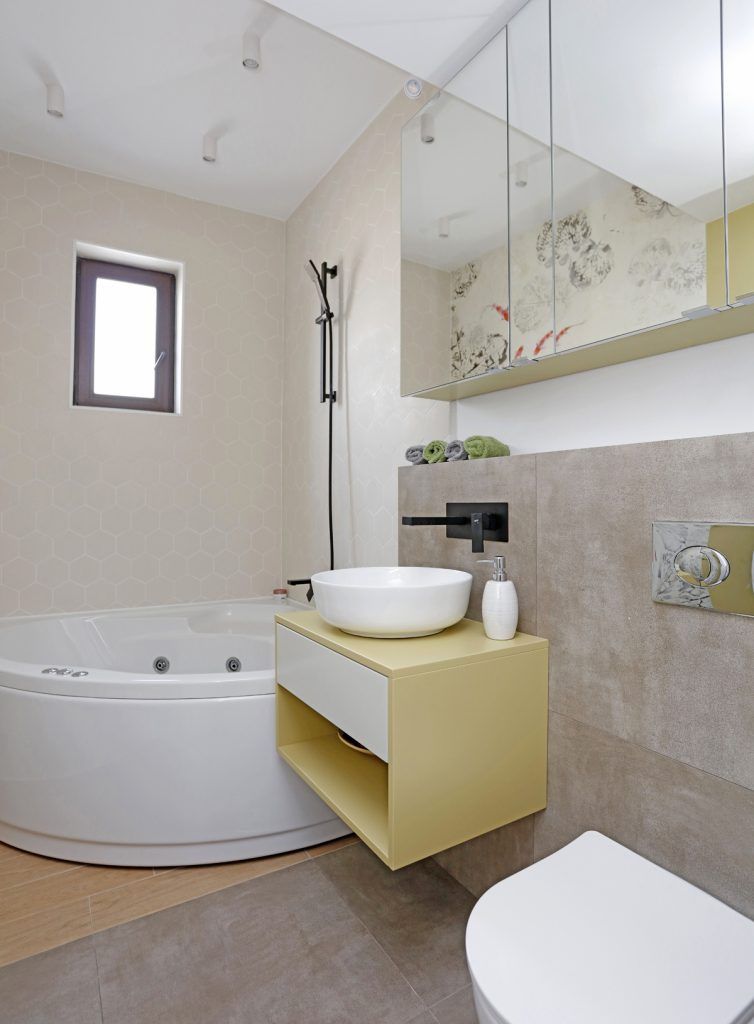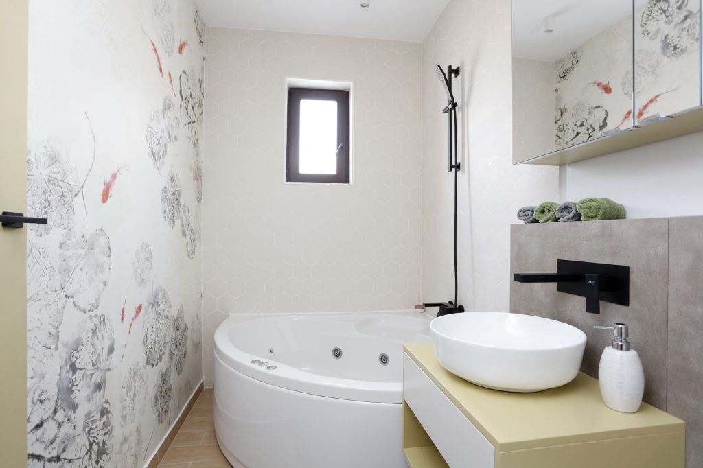 Cele doua bai au fost amenajate in aceleasi linii stilistice, mizand pe simplitate si functionalitate. Baia matrimoniala dispune de o cada de colt; pentru a accentua zona de relaxare a fost propus un tapet pe peretele opus.
