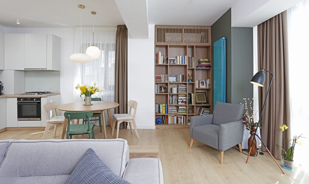 Spatiul este compartimentat eficient, zona de zi tip openspace fiind cea mai generoasa (cuprinde bucataria deschisa, locul de luat masa, livingul si un mic colt de lectura, cu o biblioteca incastrata intr-o nisa si un fotoliu confortabil).