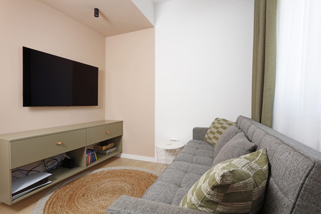 La nivel cromatic predomina alb si crem si accentele in nuante de verde, in special kaki si verde pastel (le ragasim in fiecare camera, contribuind cu succes la crearea unui decor deosebit). In zona de living a fost propus un calorifer vertical intr-o nuanta intensa de turquoise, care contrasteaza armonios cu restul amenajarii.