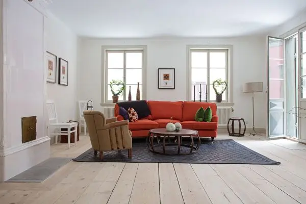 Canapeaua din living este o pata de culoare care scoate spatiul din anonimat si din banalul neutru. Rosul invioreaza camera, atragand atentia in acelasi timp si schimband intreaga atmosfera. Fiind un decor preponderent nordic, semineul nu putea lipsi.