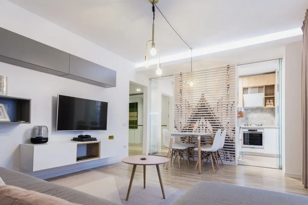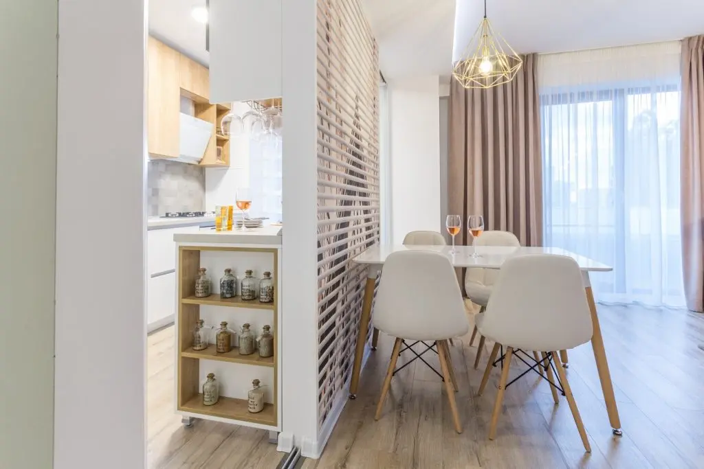 Deschide GaleriaVorbim despre un apartament de 82 metri patrati amenajat pentru un cuplu tanar. Cei doi si-au dorit un spatiu modern, actual, cu multa lumina naturala. Una din provocarile acestui proiect a fost modificarea peretelui dintre living si bucatarie. Desi ideea unei insule de bucatarie le suradea, cei doi nu-si doreau un open space total. Solutia propusa de Cristina a fost eliminarea unei portiuni din peretele separator dintre living si bucatarie, creand astfel o legatura intre cele doua functiuni. Se pastreaza astfel ideea de open space, zonele fiind totusi delimitate prin usi armonice de sticla dispuse simetric, bucataria ramanand astfel inchisa. In noul context, s-a putut integra si un mic spatiu de luat masa in living.