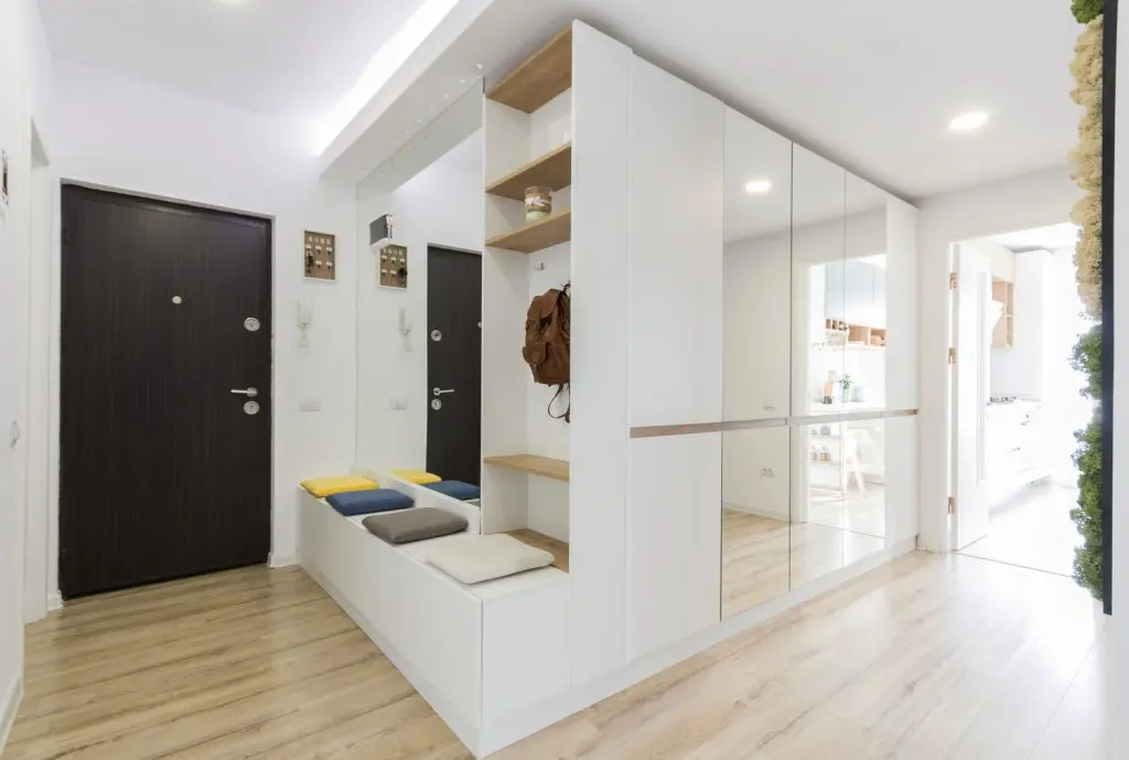 Holul inglobeaza o zona generoasa de depozitare, spatiul fiind amplificat prin oglinzi si albul mobilierului. Piesa de rezistenta o reprezinta peretele pentru biciclete, cu o vopsea neagra cu efect de tabla de scris.