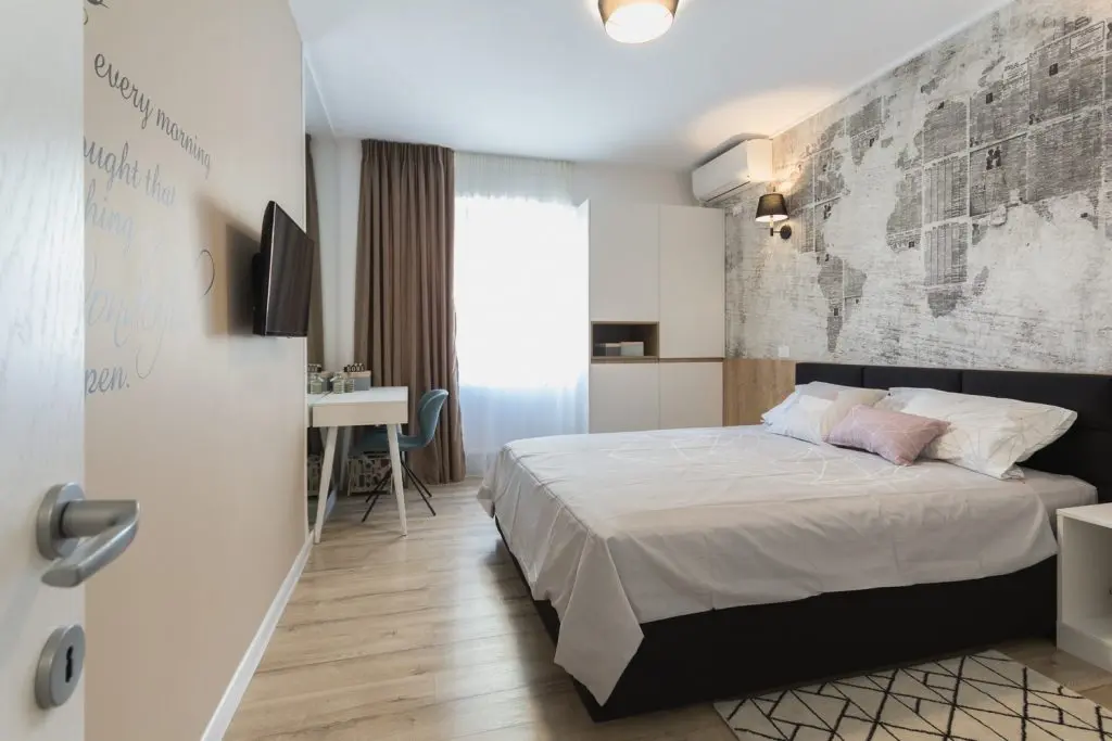 Pentru dormitor a fost creata o atmosfera calda, reconfortanta cu ajutorul unei cromatici neutre. Zona pentru make-up, accentuata de o oglinda verticala dispusa pe toata inaltimea peretelui, alaturi de piesele de mic mobilier, sunt elementele care personalizeaza spatiul. Tapetul cu harta lumii, tot de la Wall&Deco, vine ca o zona de accent menita sa puna in valoare dormitorul.