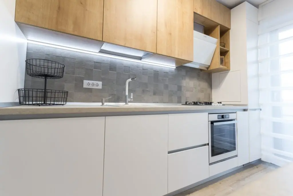 Un spatiu foarte placut este si bucataria. Desi lunga si ingusta, Cristina a optimizat eficient incaperea, asigurand nevoile de depozitare printr-o dispunere liniara a mobilierului de baza, completat de corpuri suspendate pe peretele paralel, cel comun cu livingul. Finisajele in tonuri deschise sporesc luminozitatea bucatariei si amplifica spatiul.