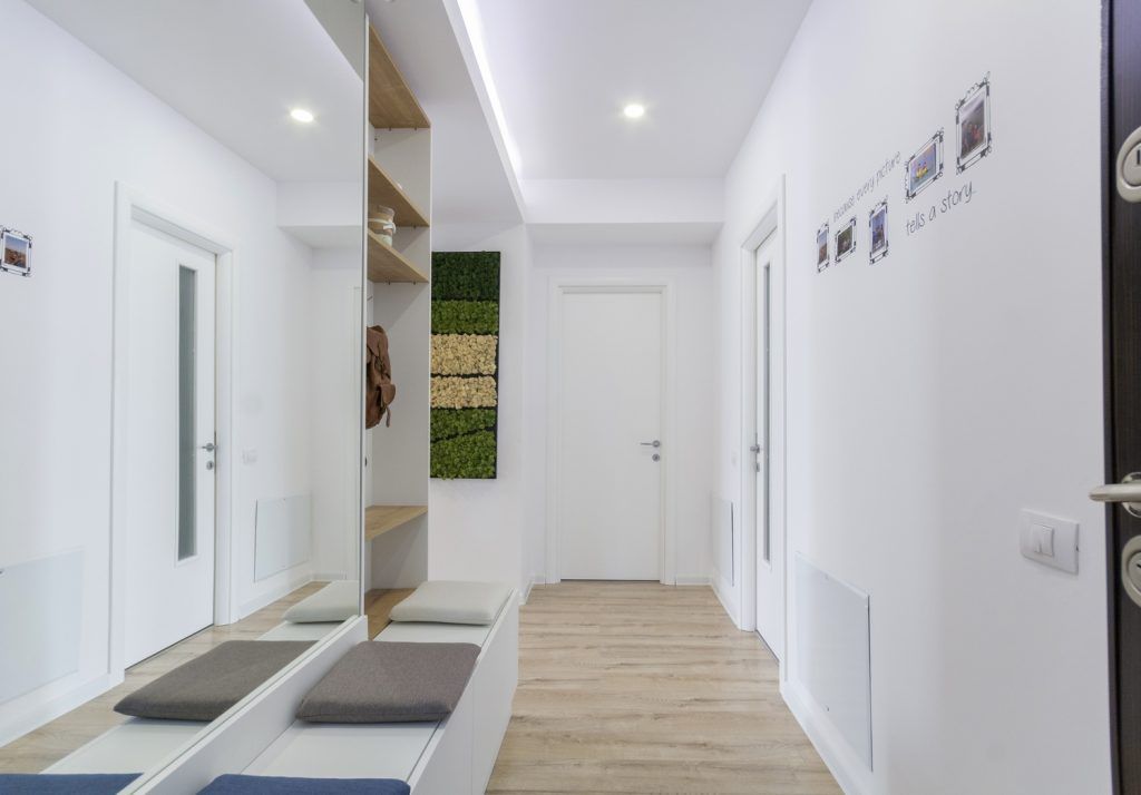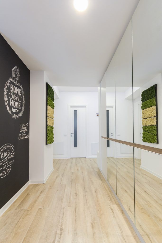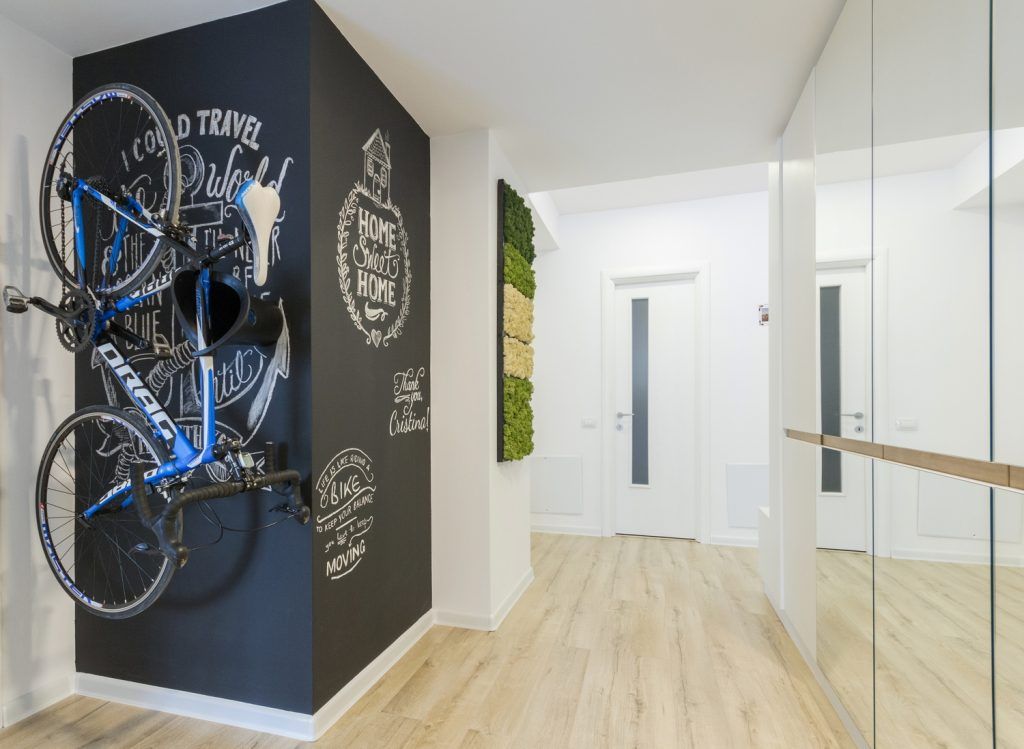 Holul inglobeaza o zona generoasa de depozitare, spatiul fiind amplificat prin oglinzi si albul mobilierului. Piesa de rezistenta o reprezinta peretele pentru biciclete, cu o vopsea neagra cu efect de tabla de scris.