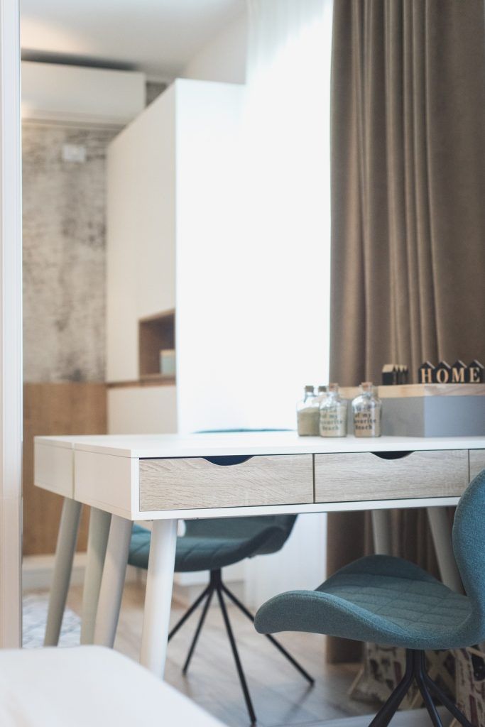 Mobilarea este minimala, cu finisaje naturale, in spiritul interioarelor nordice. Tapetul Wall&Deco din zona mesei creeaza o zona de accent tocmai pentru a evidentia aceasta mica functiune in cadrul camerei de zi.