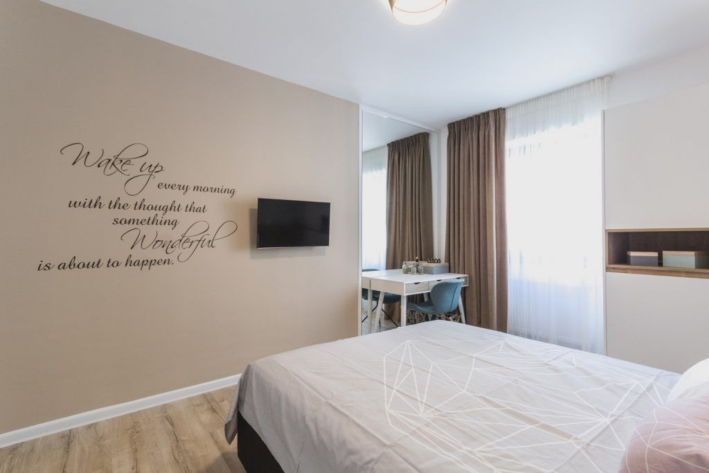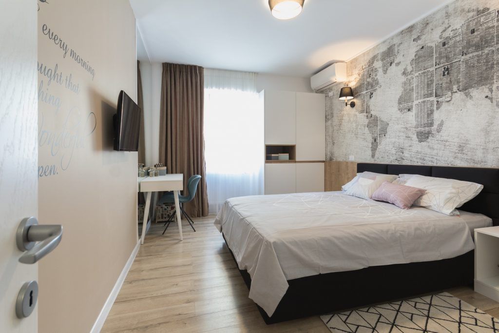 Pentru dormitor a fost creata o atmosfera calda, reconfortanta cu ajutorul unei cromatici neutre. Zona pentru make-up, accentuata de o oglinda verticala dispusa pe toata inaltimea peretelui, alaturi de piesele de mic mobilier, sunt elementele care personalizeaza spatiul. Tapetul cu harta lumii, tot de la Wall&Deco, vine ca o zona de accent menita sa puna in valoare dormitorul.