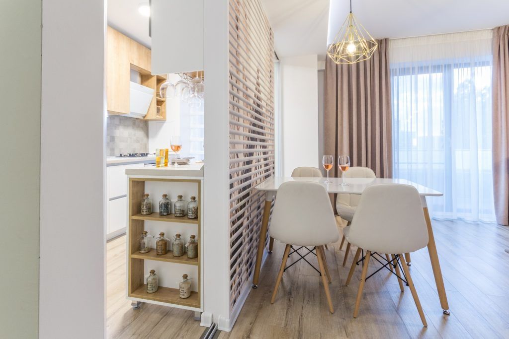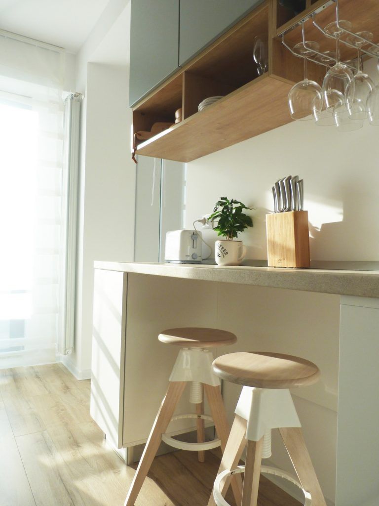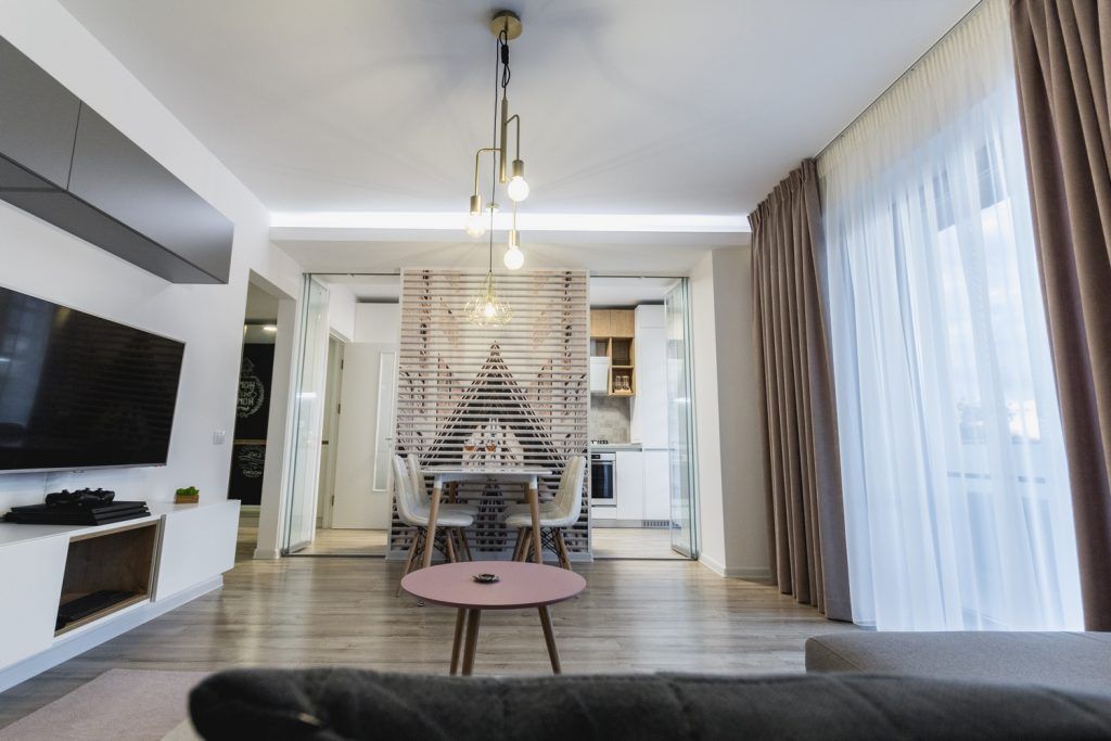 Deschide GaleriaVorbim despre un apartament de 82 metri patrati amenajat pentru un cuplu tanar. Cei doi si-au dorit un spatiu modern, actual, cu multa lumina naturala. Una din provocarile acestui proiect a fost modificarea peretelui dintre living si bucatarie. Desi ideea unei insule de bucatarie le suradea, cei doi nu-si doreau un open space total. Solutia propusa de Cristina a fost eliminarea unei portiuni din peretele separator dintre living si bucatarie, creand astfel o legatura intre cele doua functiuni. Se pastreaza astfel ideea de open space, zonele fiind totusi delimitate prin usi armonice de sticla dispuse simetric, bucataria ramanand astfel inchisa. In noul context, s-a putut integra si un mic spatiu de luat masa in living.