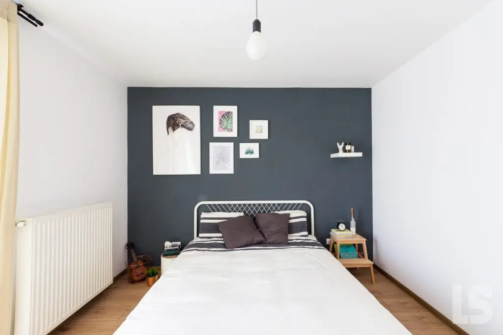 In dormitor, atentia se indreapta spre zona patului, mai exact asupra peretelui-accent decorat cu un gri inchis. Si aici s-a urmarit aceeasi linie minimala a amenajarii, cu piese de baza si decoratiuni discrete. Depozitarea principala este mutata in spatiul holului, ce inglobeaza dulapurile pentru haine, dar si o zona cu rafturi deschise pentru carti.