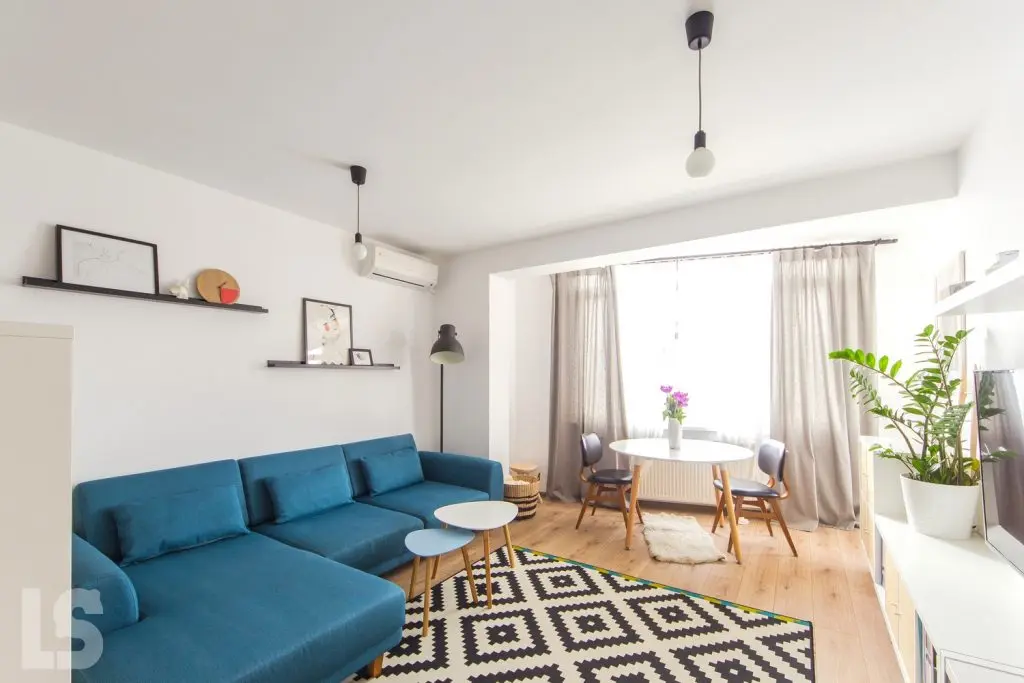 In living, mobilarea este minimala pentru a pastra totul cat mai aerisit si degajat. Ne atrag atentia canapeaua turcoaz (de la Mobila Dalin) si covorul cu motiv geometric, cele doua elemente contrastand cu suprafetele albe ale mobilierului, carora le-au fost adaugate picioare din lemn de mesteacan. Masuta de cafea este de la Jysk.