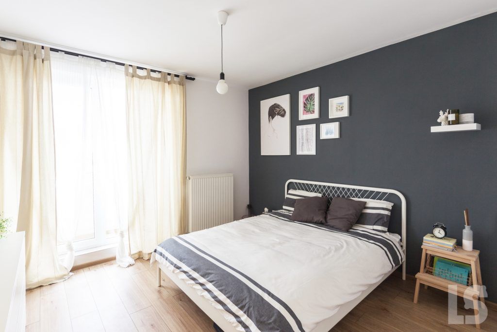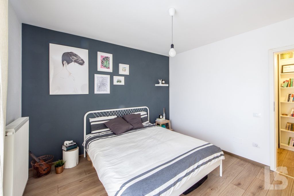 In dormitor, atentia se indreapta spre zona patului, mai exact asupra peretelui-accent decorat cu un gri inchis. Si aici s-a urmarit aceeasi linie minimala a amenajarii, cu piese de baza si decoratiuni discrete. Depozitarea principala este mutata in spatiul holului, ce inglobeaza dulapurile pentru haine, dar si o zona cu rafturi deschise pentru carti.