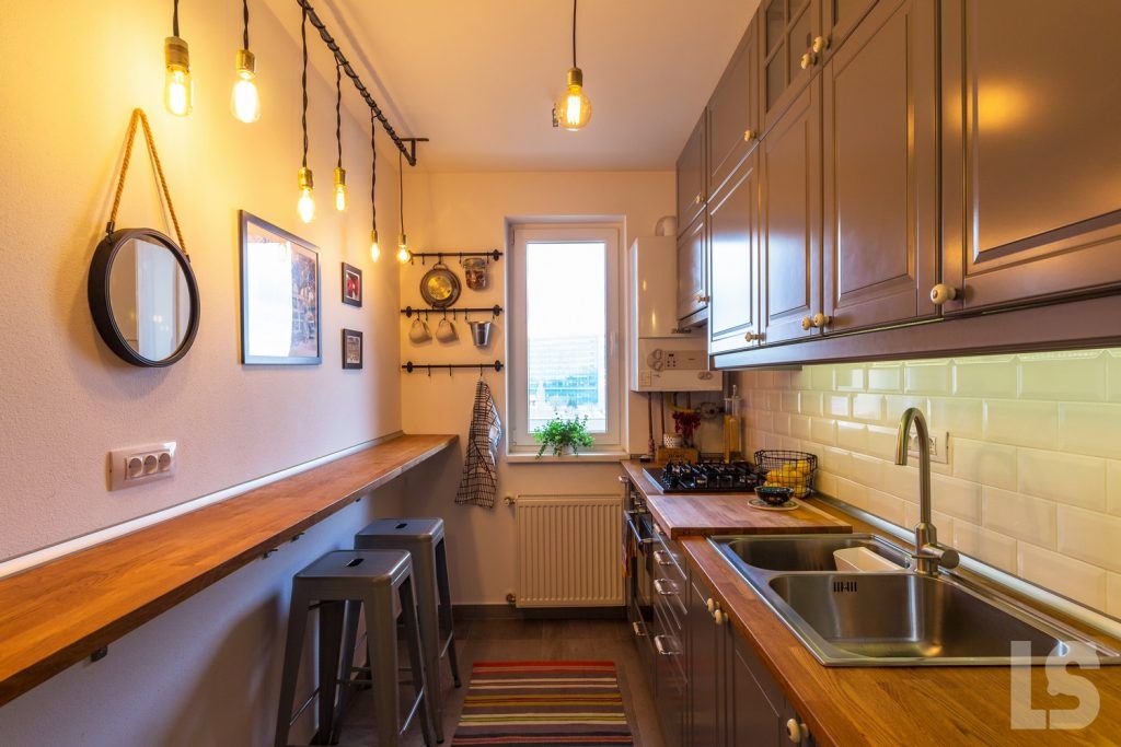 Pentru bucatarie s-a realizat o imbinare de stiluri, un joc al contrastelor, intre materiale reci si calde, rezultand un design contemporan cu insertii vintage. Configuratia lunga si ingusta a impus o dispunere liniara a zonelor de lucru; de cealalta parte a bucatariei a fost integrat un blat lung din lemn de stejar, folosit ca zona de bar sau loc pentru gustari rapide. Mobilierul cu front din M DF vopsit gri este de la IKEA (la fel si blatul). Electrocasnicele sunt incorporate pentru a pastra totul cat mai unitar, iar braul dintre dulapuri este placat cu faianta alba tip Metro.