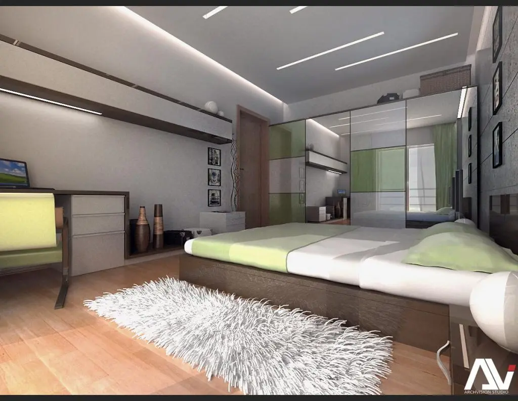 Detaliile organice inspirate din natura se regasesc si in cele doua dormitoare. Nuantele de verde se integreaza de minune in contextul mentionat, fiind practic o continuare a peisajului din exterior in interiorul locuintei.