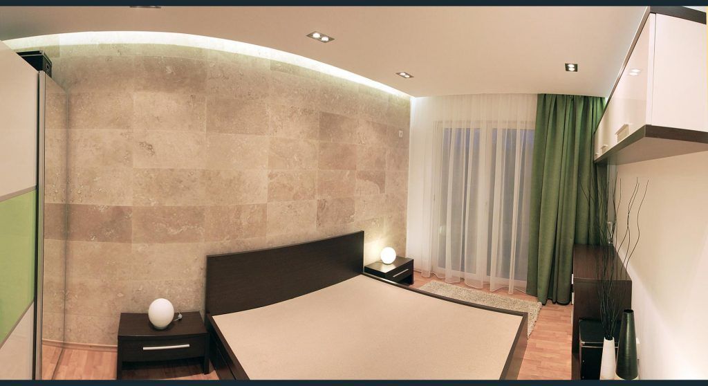 Detaliile organice inspirate din natura se regasesc si in cele doua dormitoare. Nuantele de verde se integreaza de minune in contextul mentionat, fiind practic o continuare a peisajului din exterior in interiorul locuintei.