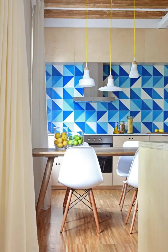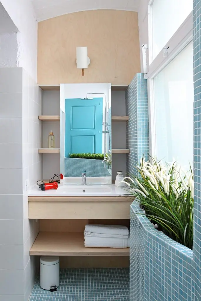 Finisajele se remarca prin mozaicul albastru din baie, panourile de mesteacan si parchetul industrial.