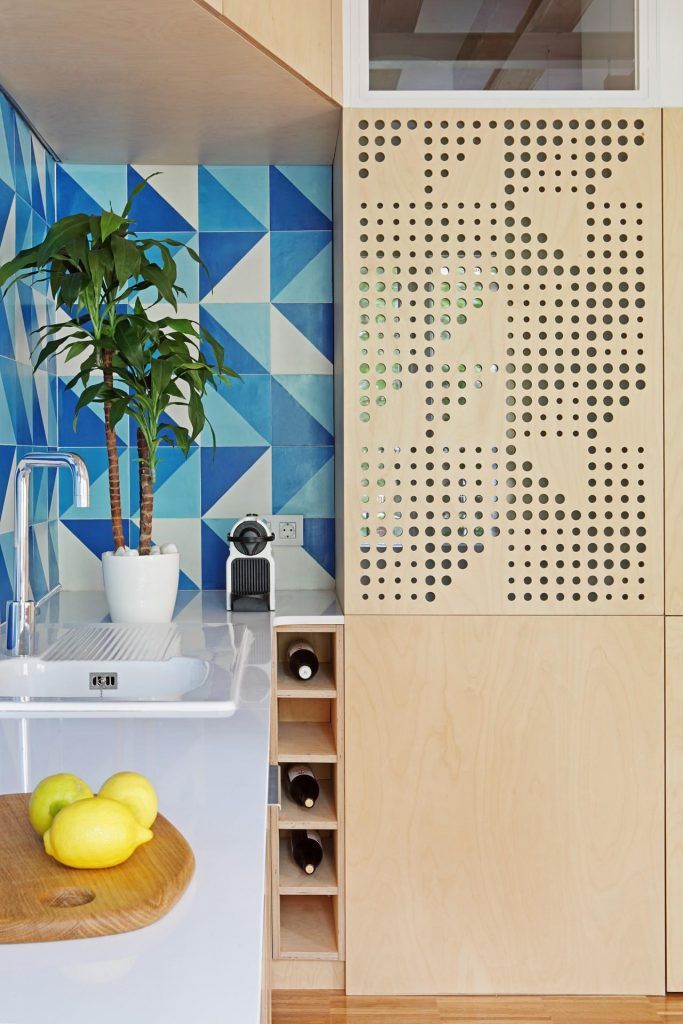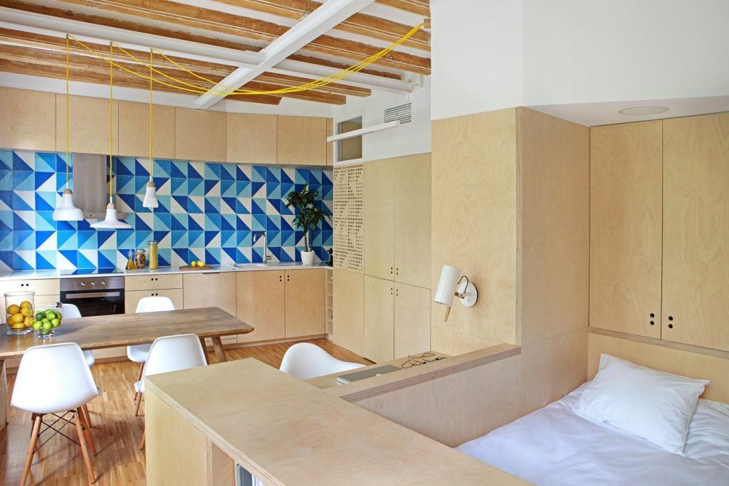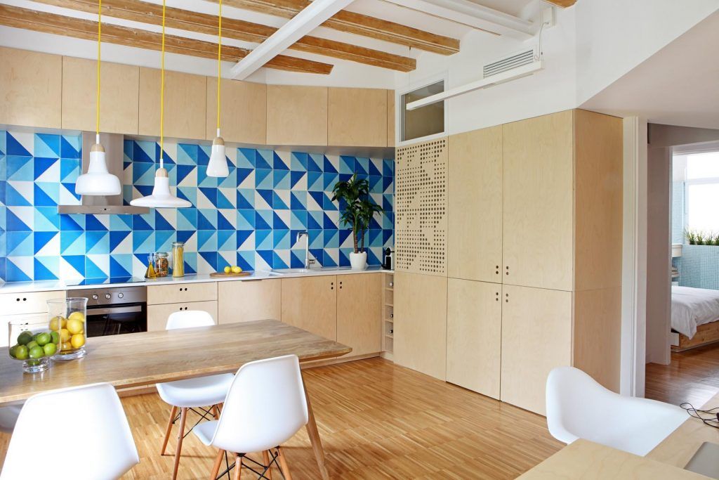 Finisajele se remarca prin mozaicul albastru din baie, panourile de mesteacan si parchetul industrial.