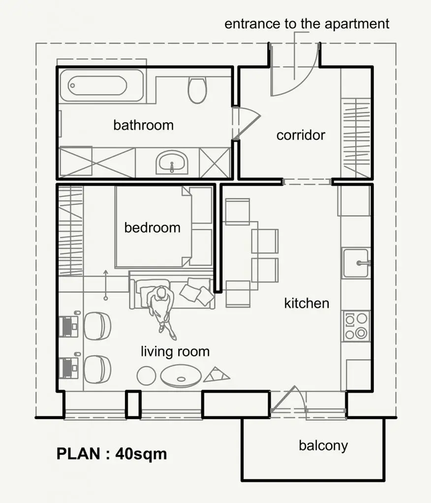 Iata si schema acestui apartament de 40 de metri patrati.