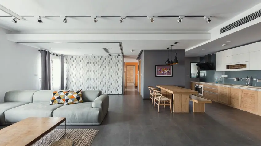 Zona de living este una extrem de spatioasa si de luminoasa, iar stilul in care s-ar incadra ar putea fi unul minimalist cu mici influente industriale. Un rol important în crearea acestui spaţiu vibrat si dinamic îl joaca nuanta metaalica a peretilor, liniile drepte si evitarea incarcarii inutile a decorului.