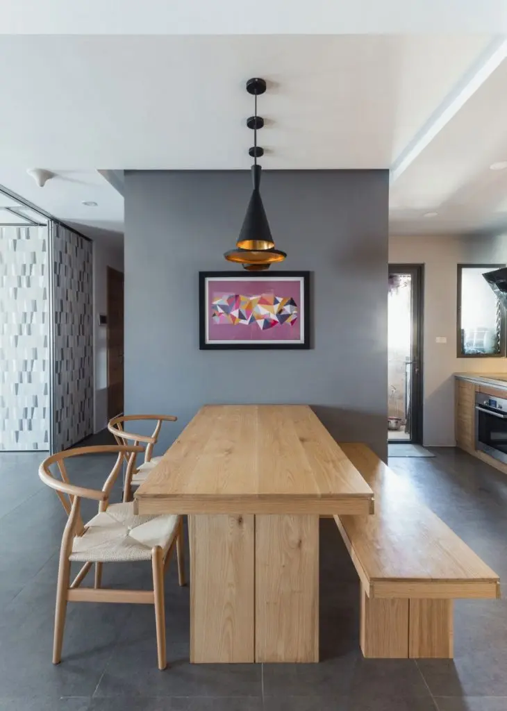 Jocul intre cald si rece in ceea ce priveste culorile alese pentru pereti si tavan creeaza o anumita tensiune care improspateaza atmosfera din punct de vedere vizual.