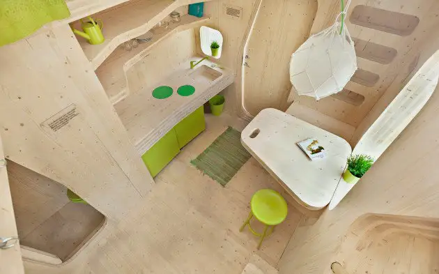Hamacul este locul ideal pentru relaxare si lectura; fiind suspendat, el nu ocupa loc in podea. Etajerele fixate in perete functioneaza ca scari pentru a accesa zona de dormit. Geamurile asemanatoare unor hublouri ofera lumina necesara pentru ca spatiul sa nu para prea intunecat sau claustrofob.