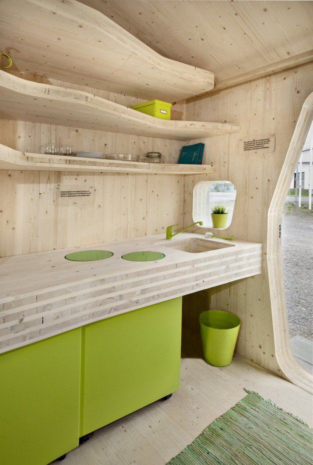 Apartamentul a fost conceput intr-o structura compacta, individuala, care ofera confortul necesar, incluzand aici spatiul pentru dormit, bucatarie, baie si o mica curte. Gratie materialului folosit, lemn stratificat si a tehnologiei de prelucrare, impactul ecologic este redus.