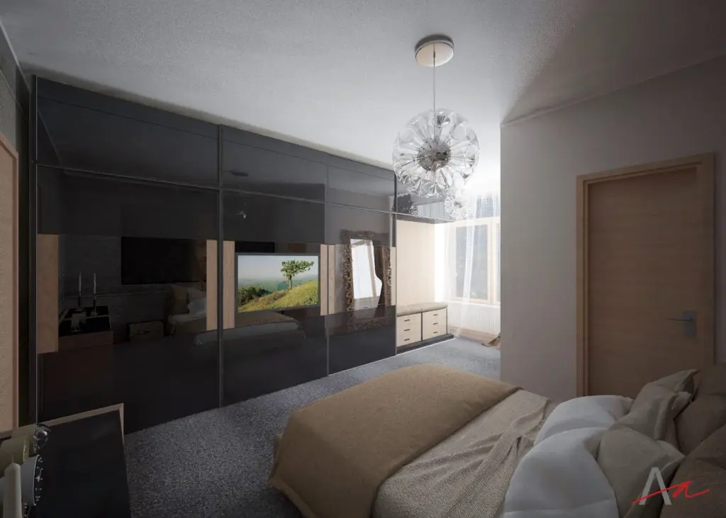Integrarea televizorului in dulap ne-a creat cele mai mari probleme. Intrucat pe piata nu sunt multe sisteme care sa permita integrarea unui televizor in dulap, fara sa compromita spatiul din spatele televizorului, impreuna cu inginerul firmei de mobilier am realizat personalizarea unui sistem existent care sa satisfaca toate cerintele. Pentru a da un plus de valoare dulapului, oglinda fumurie a fost integrata pe doua din usile dulapului.