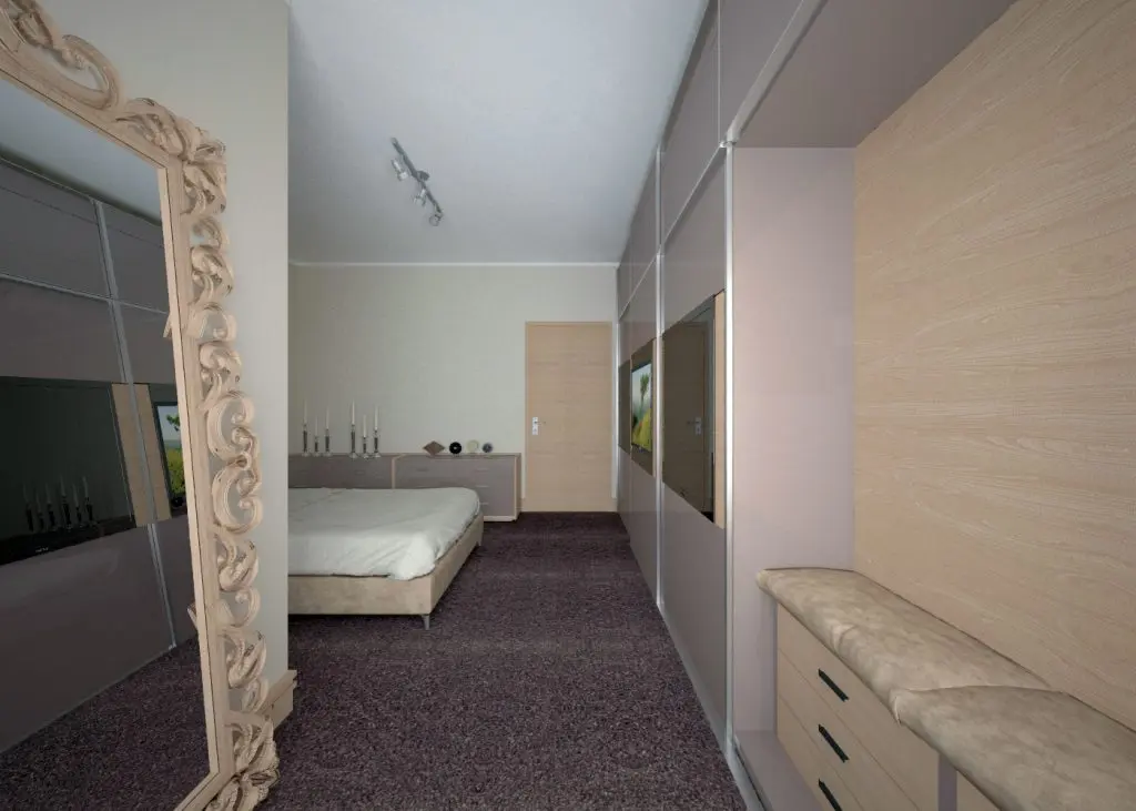 Am compartimentat impreuna interiorul dulapului, aceasta compartimentare fiind facuta dupa nevoile beneficiarului si am decis achizionarea unui pat de dimensiuni mai mici fata de ce isi dorea beneficiarul ( 200200, dimensiunea saltelei fiind 180200). De comun acord s-a optat pentru schimbarea materialului de la jaluzele, intrucat acesta nu se incadra in stilul ales. Parchetul a fost inlocuit cu mocheta si, in plus am adus inca o comoda pentru o mai buna depozitare a lucrurilor.
