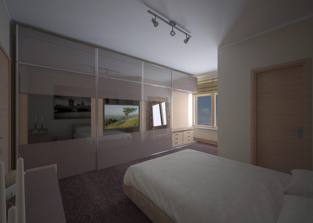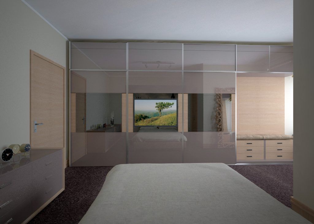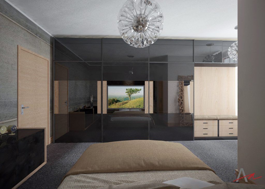 Integrarea televizorului in dulap ne-a creat cele mai mari probleme. Intrucat pe piata nu sunt multe sisteme care sa permita integrarea unui televizor in dulap, fara sa compromita spatiul din spatele televizorului, impreuna cu inginerul firmei de mobilier am realizat personalizarea unui sistem existent care sa satisfaca toate cerintele. Pentru a da un plus de valoare dulapului, oglinda fumurie a fost integrata pe doua din usile dulapului.