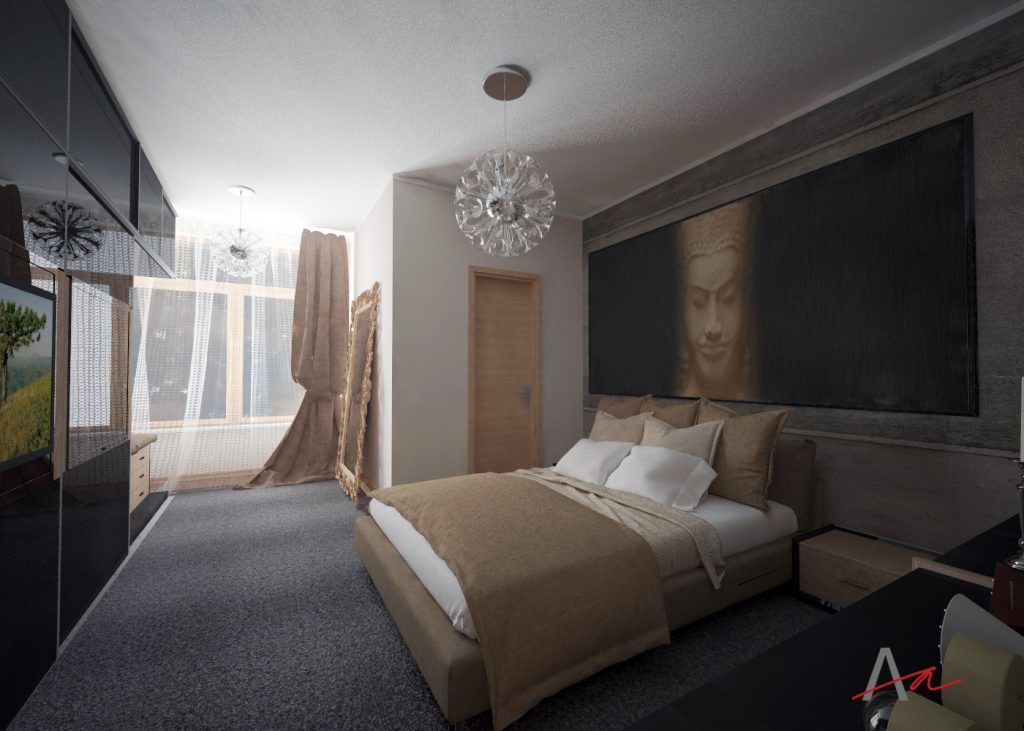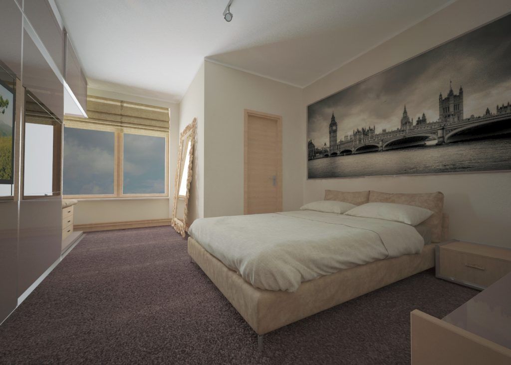 Am compartimentat impreuna interiorul dulapului, aceasta compartimentare fiind facuta dupa nevoile beneficiarului si am decis achizionarea unui pat de dimensiuni mai mici fata de ce isi dorea beneficiarul ( 200200, dimensiunea saltelei fiind 180200). De comun acord s-a optat pentru schimbarea materialului de la jaluzele, intrucat acesta nu se incadra in stilul ales. Parchetul a fost inlocuit cu mocheta si, in plus am adus inca o comoda pentru o mai buna depozitare a lucrurilor.