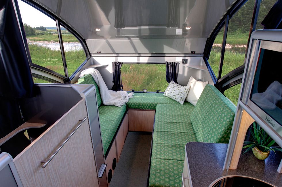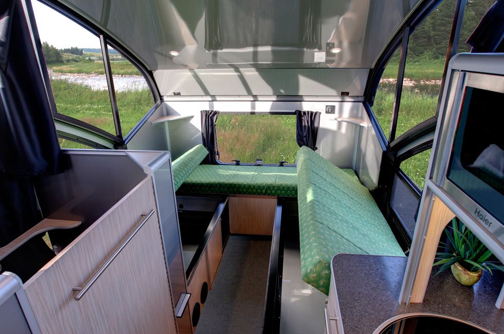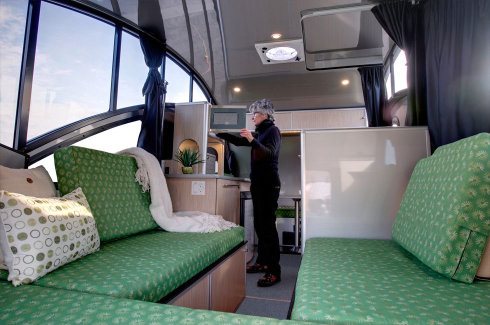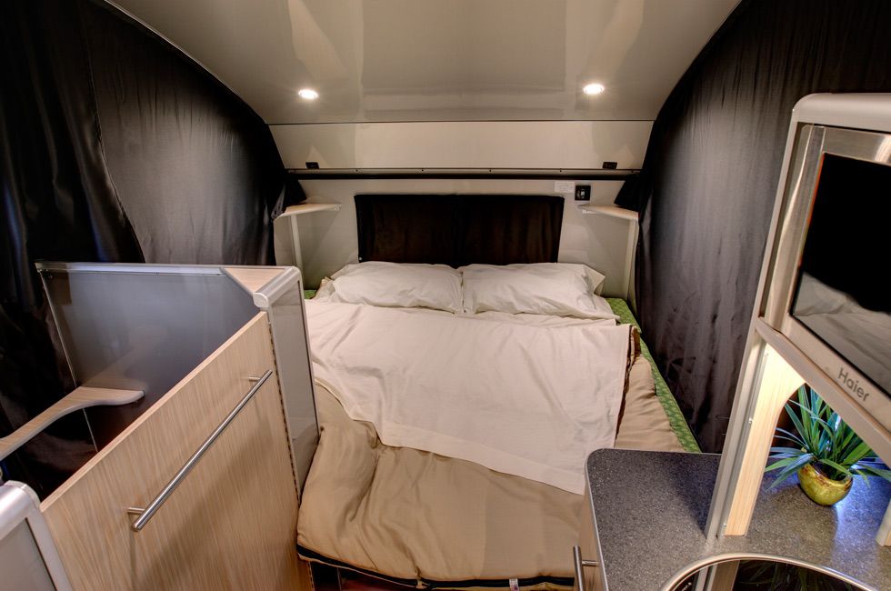 Acoperisul acestui “apartament”, construit din rulota aceasta mobila, este unul retractabil care iti ofera o priveliste uimitoare, in timp ce stai intins in pat, relaxandu-te intr-o excursie de vis.