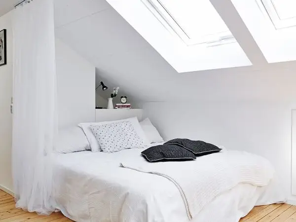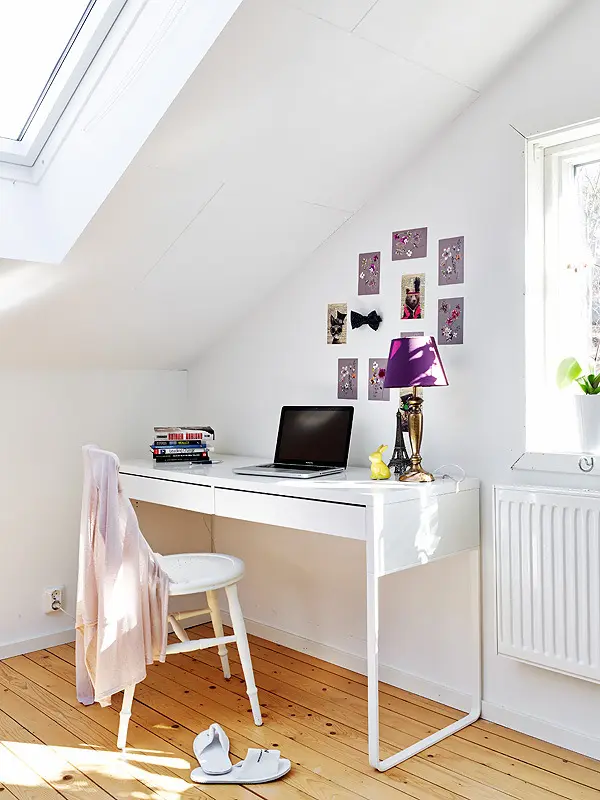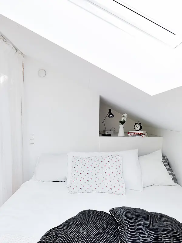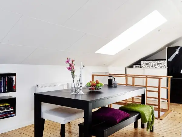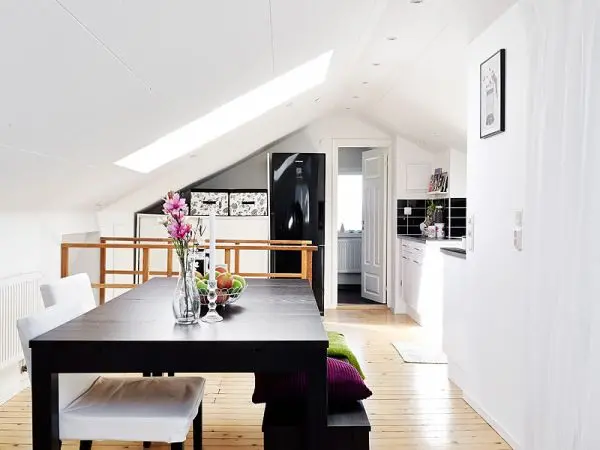 De multe ori un inconvenient al locuitului la mansarda este insuficienta luminii naturale. Insa, in acest caz, spatiul primeste o cantitate suficienta care sa scoata in evidenta frumusetea locuintei si mai ales sa sporeasca senzatia de spatialitate. Gratie ferestrelor montate in tavan si peretilor vopsiti intr-un alb stralucitor, intreaga locuinta pare aerisita si dinamica.