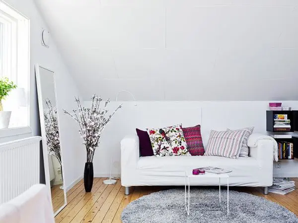 Partea dedicata socializarii este evidentiata printr-o sofa, o mini-masuta de cafea si doua rafturi suspendate pentru depozitare; rolul oglinzii aici este acela de a reflecta lumina si a spori iluzia de spatialitate. Ca o veritabila locuinta scandinava, plantele improspateaza decorul intr-un mod placut. Baia mica are un farmec aparte prin suportul de lumanari vintage.