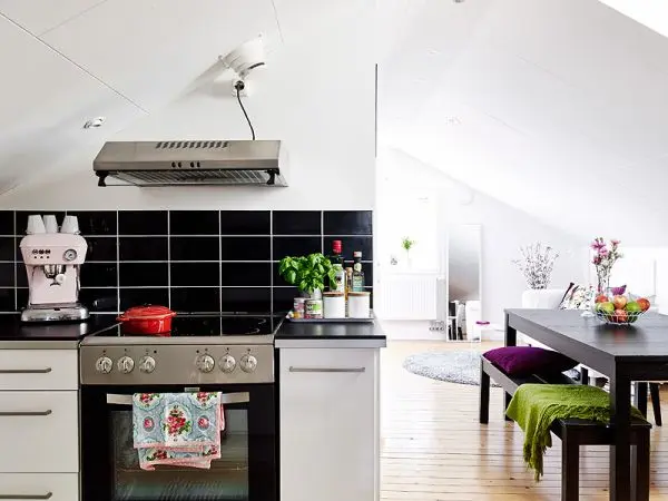 Contrastul alb-negru se regaseste de asemenea si inalte zone, precum cea a bucatariei