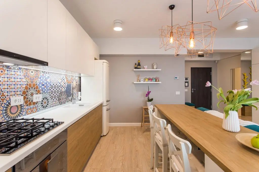 Si pentru bucatarie s-a mizat pe aceeasi abordare compacta, cu dispunere in linie dreapta a corpurilor de mobilier si cu electrocasnice incorporate pentru a pastra caracterul unitar al amenajarii. Placile decorative fac parte din colectia Andalusi, de la Realonda, Spania. Zona de luat masa este si ea pusa in valoare prin corpurile de iluminat ce atrag atentia prin valoarea lor decorativa.