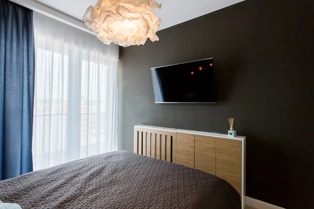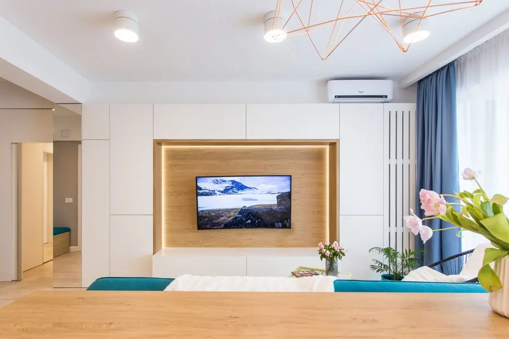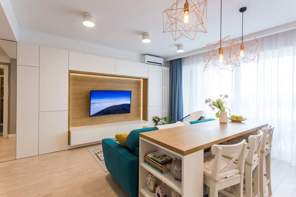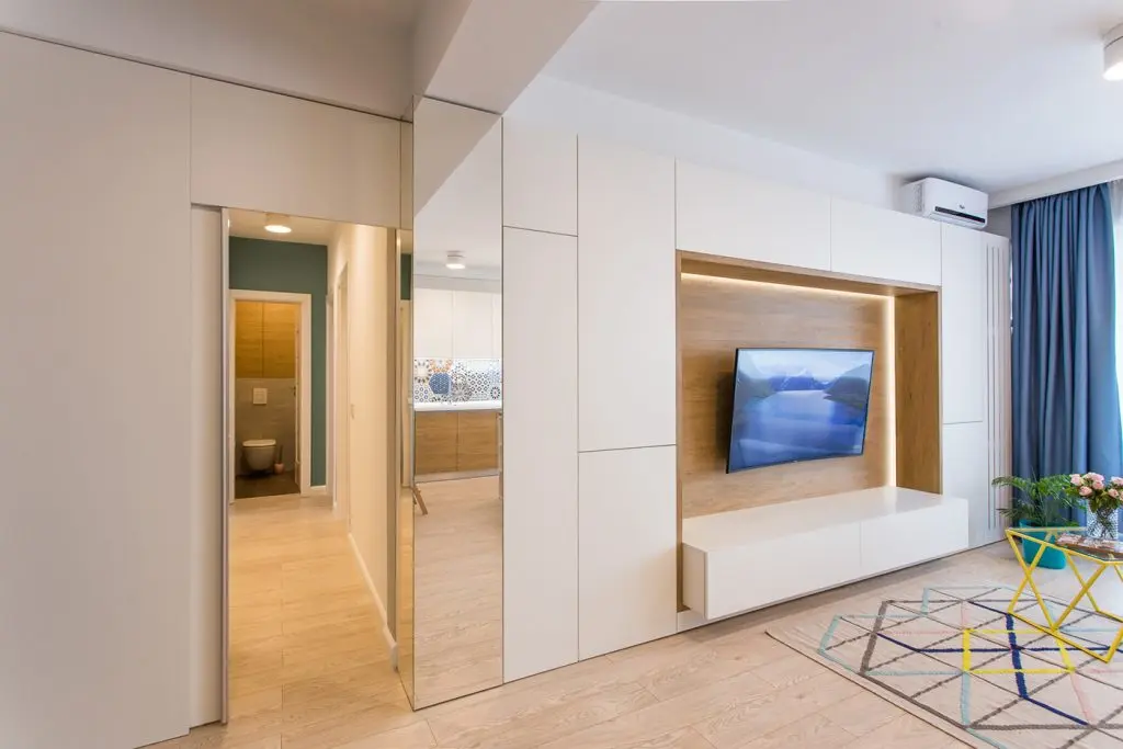 Au impartit in mod coerent spatiul in zona de zi si zona de noapte. Mobilierul din living se continua si in hol cu o usa integrata ce permite accesul spre celelalte camere.