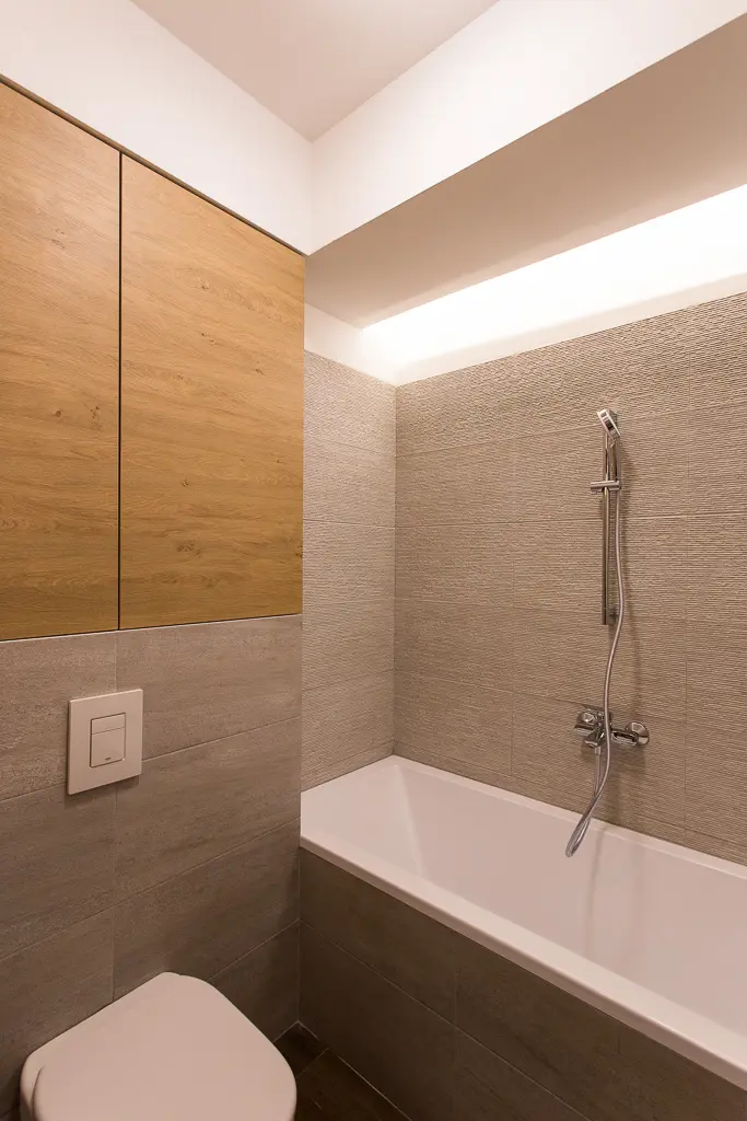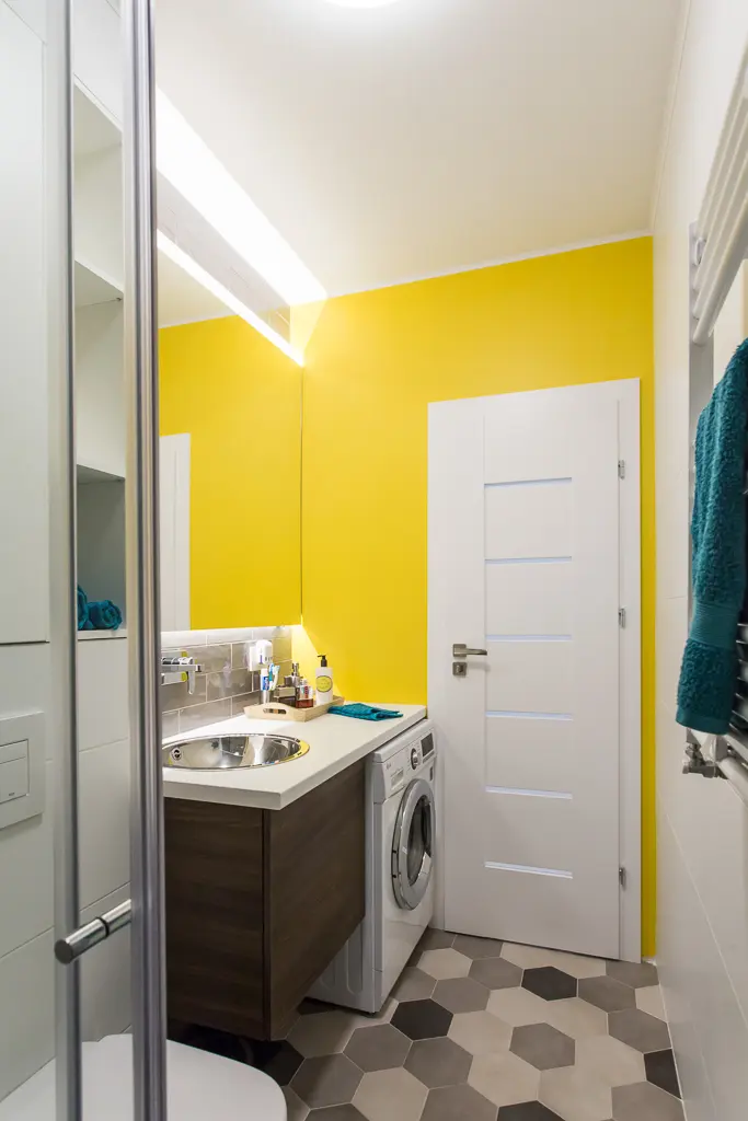 Cele 2 bai pastreaza caracterul functional al amenajarii, cu multiple spatii de depozitare, cu masina de spalat rufe integrata in spatiul de sub lavoar, cu o cabina de dus in baia de serviciu, si cada in baia principala. Finisajele descriu 2 bai moderne, placute vizual gratie culorilor ce preiau din spatiile carora le servesc, baia de serviciu cu un mix de galben si albastru precum in zona de zi si respectiv tonuri mai inchise din baia principala ce amintesc de decorul dormitorului.
