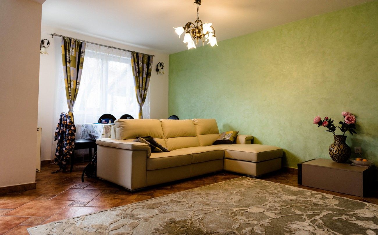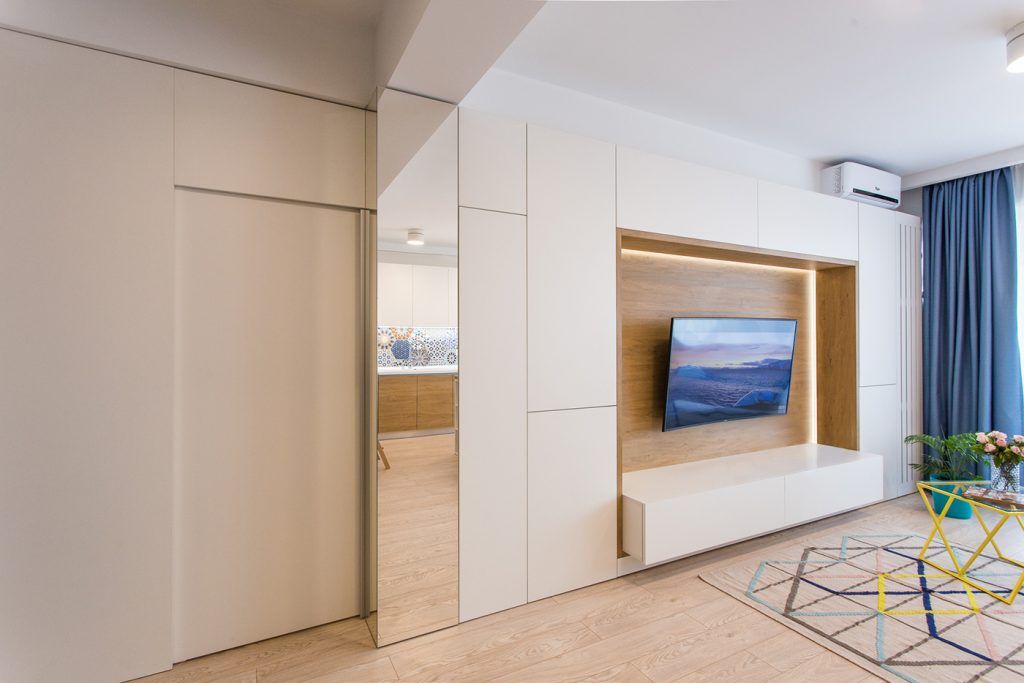 Au impartit in mod coerent spatiul in zona de zi si zona de noapte. Mobilierul din living se continua si in hol cu o usa integrata ce permite accesul spre celelalte camere.