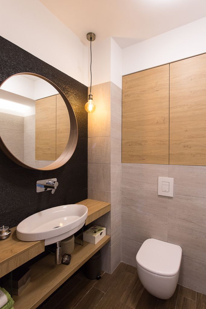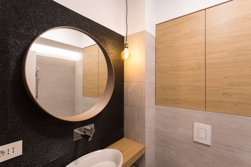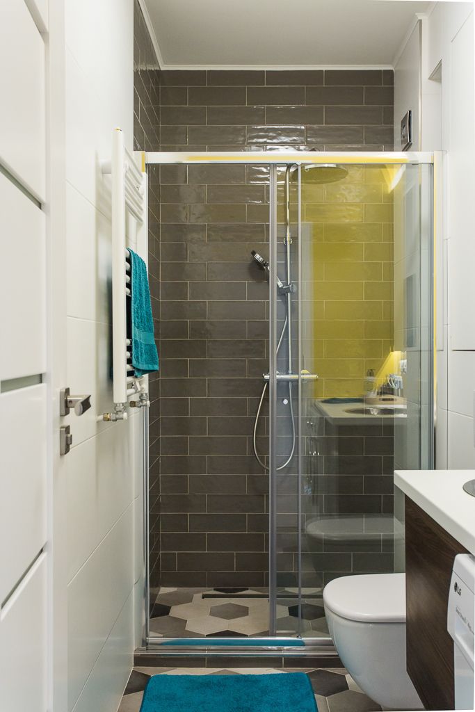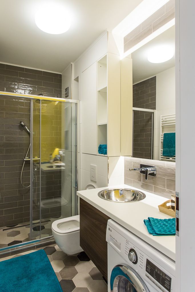 Cele 2 bai pastreaza caracterul functional al amenajarii, cu multiple spatii de depozitare, cu masina de spalat rufe integrata in spatiul de sub lavoar, cu o cabina de dus in baia de serviciu, si cada in baia principala. Finisajele descriu 2 bai moderne, placute vizual gratie culorilor ce preiau din spatiile carora le servesc, baia de serviciu cu un mix de galben si albastru precum in zona de zi si respectiv tonuri mai inchise din baia principala ce amintesc de decorul dormitorului.