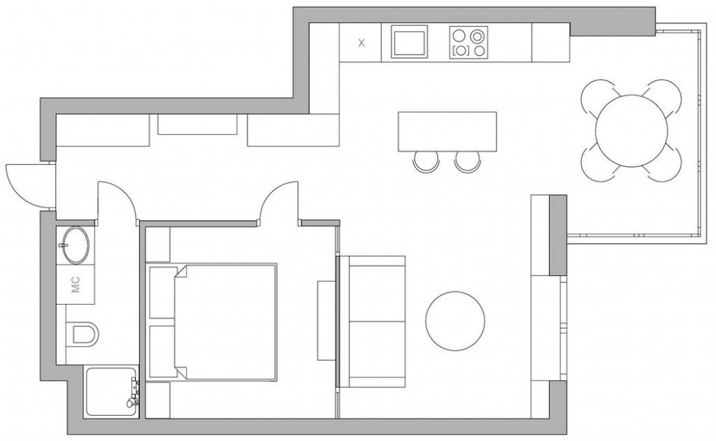 Deschide GaleriaApartamentul a fost reamenajat ca unul de doua camere, cu living si bucatarie deschisa, dar si cu un mic dormitor. In plus, balconul a fost transformat in camera, prelungind astfel bucataria.
